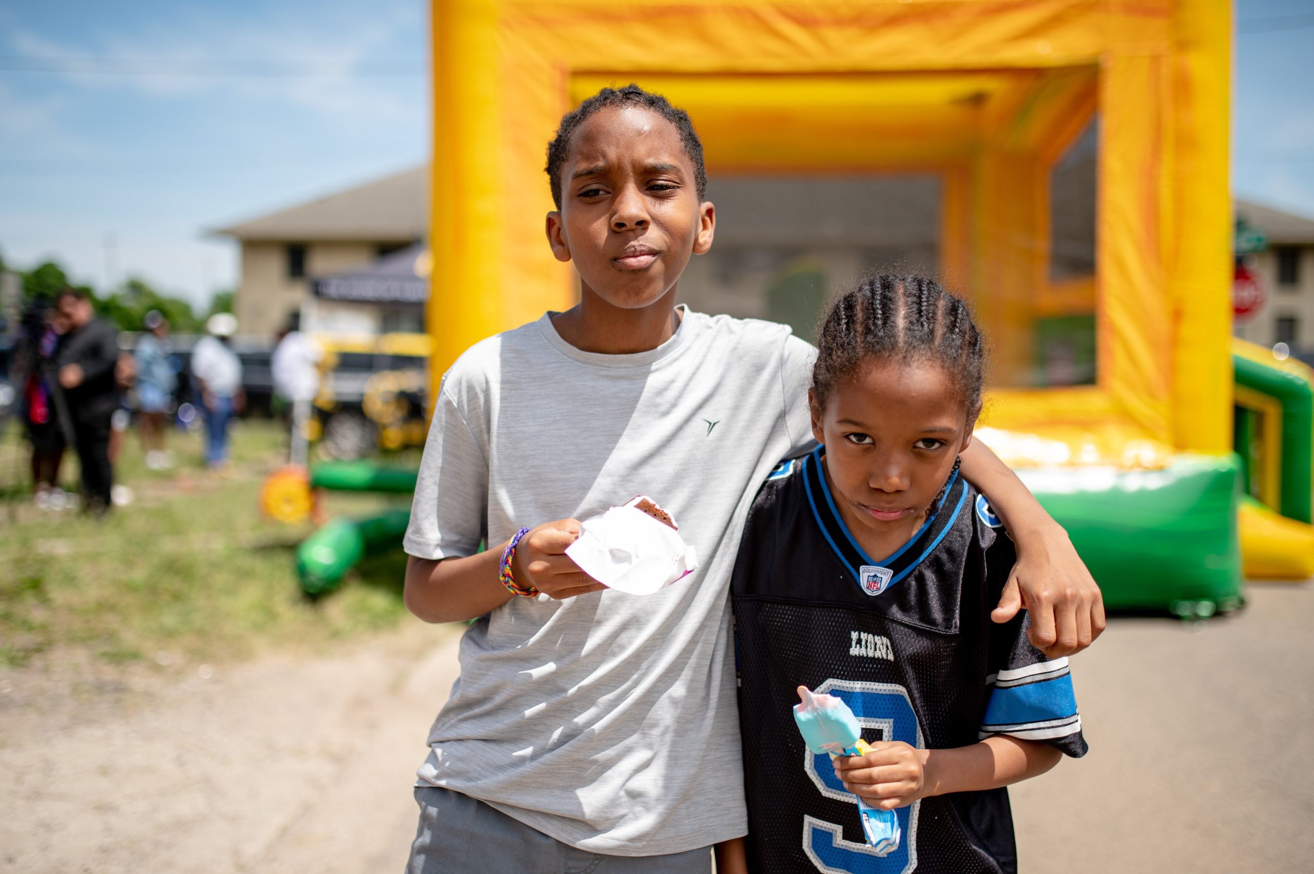 Deontre Burke and JR Toby pose for a portrait while eating ice cream at a block party for famed Flint boxer Claressa Shields on the street she grew up on in Flint’s Northside on Sunday, June 19, 2022. The city changed the name of the street, formerly Spencer Street, to Claressa Shields Street in her honor. (Michael Indriolo | Flint Beat)