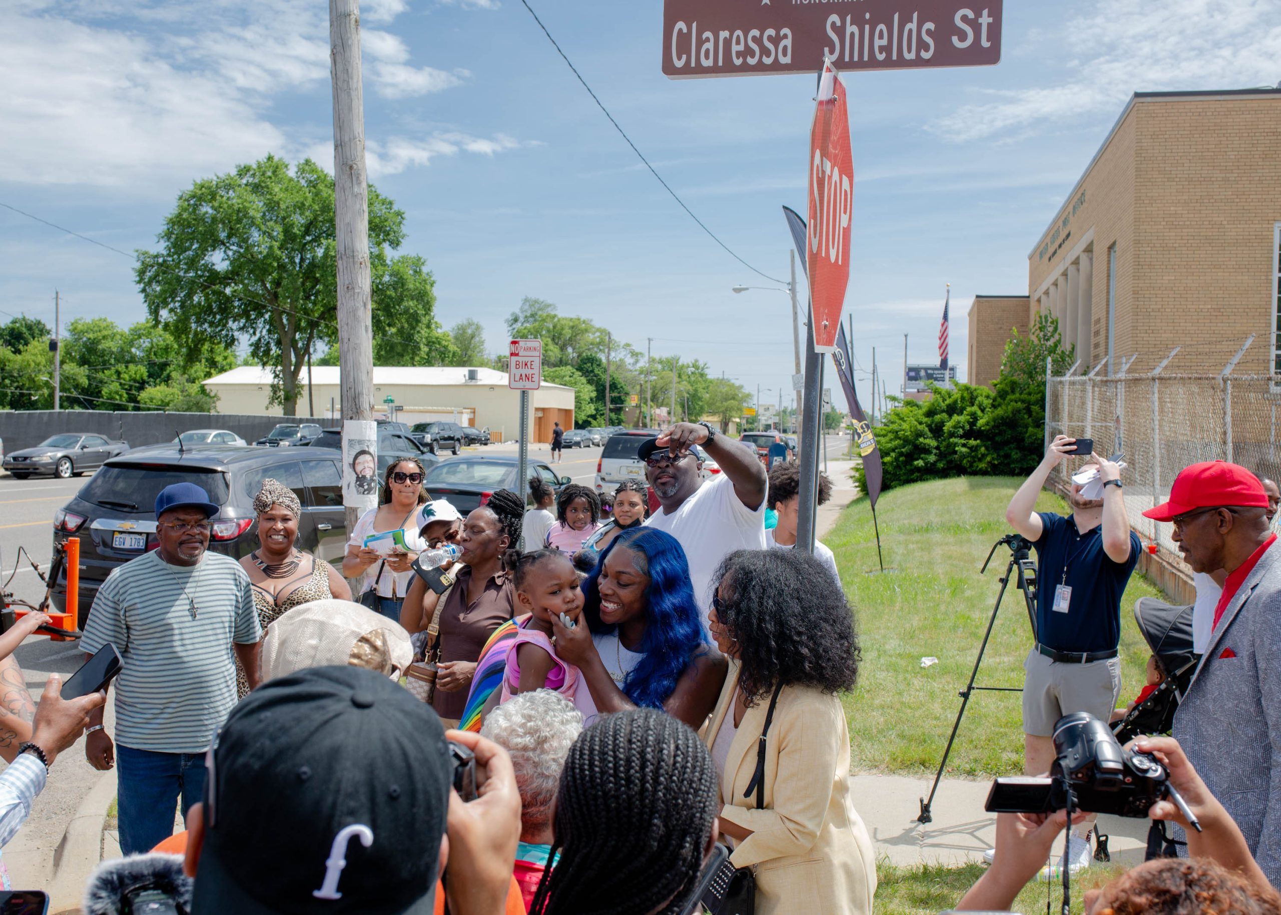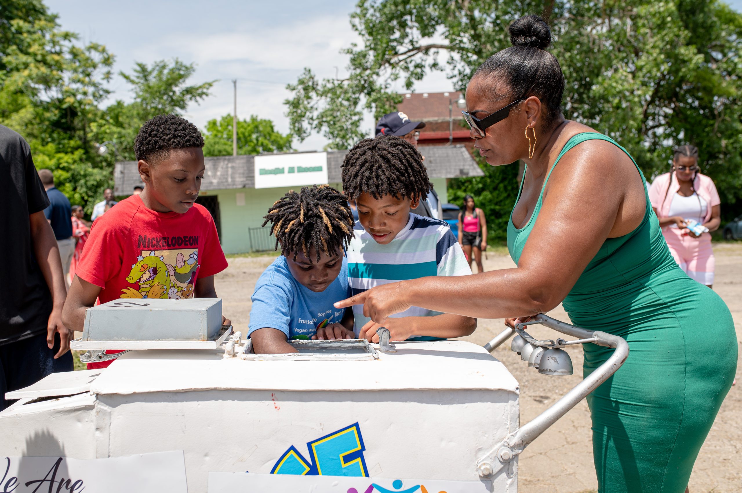 Claressa Shields takes photos in front of the newly unveiled Claressa Shields Street sign on the north side of Flint, Mich. on June 19, 2022. (KT Kanazawich | Flint Beat)April Cook-Hawkins serves ice cream at a block party for famed Flint boxer Claressa Shields on the street Shields grew up on in Flint’s Northside on Sunday, June 19, 2022. The city changed the name of the street, formerly Spencer Street, to Claressa Shields Street in her honor. (Michael Indriolo | Flint Beat)