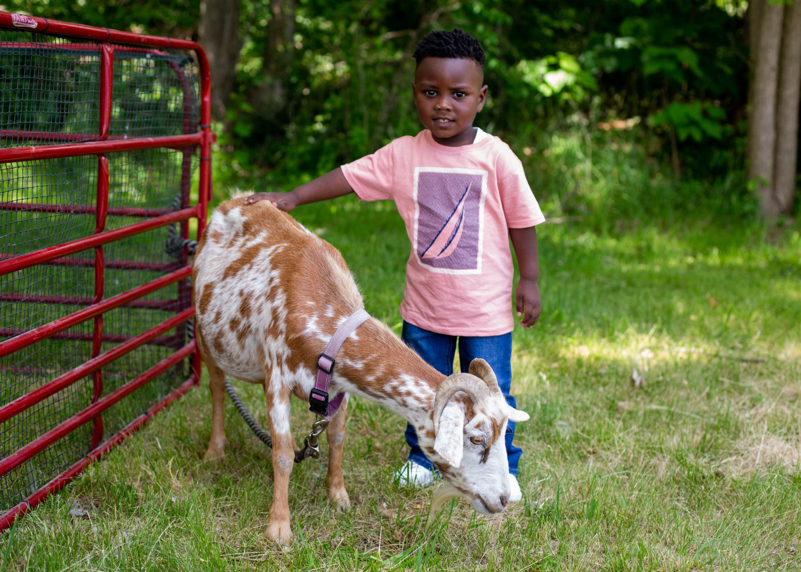 Blu Beavers, 3, of Flint, pets a goat on the north side of Flint, Mich. during the Claressa Shields street renaming event on June 19, 2022. (KT Kanazawich | Flint Beat)