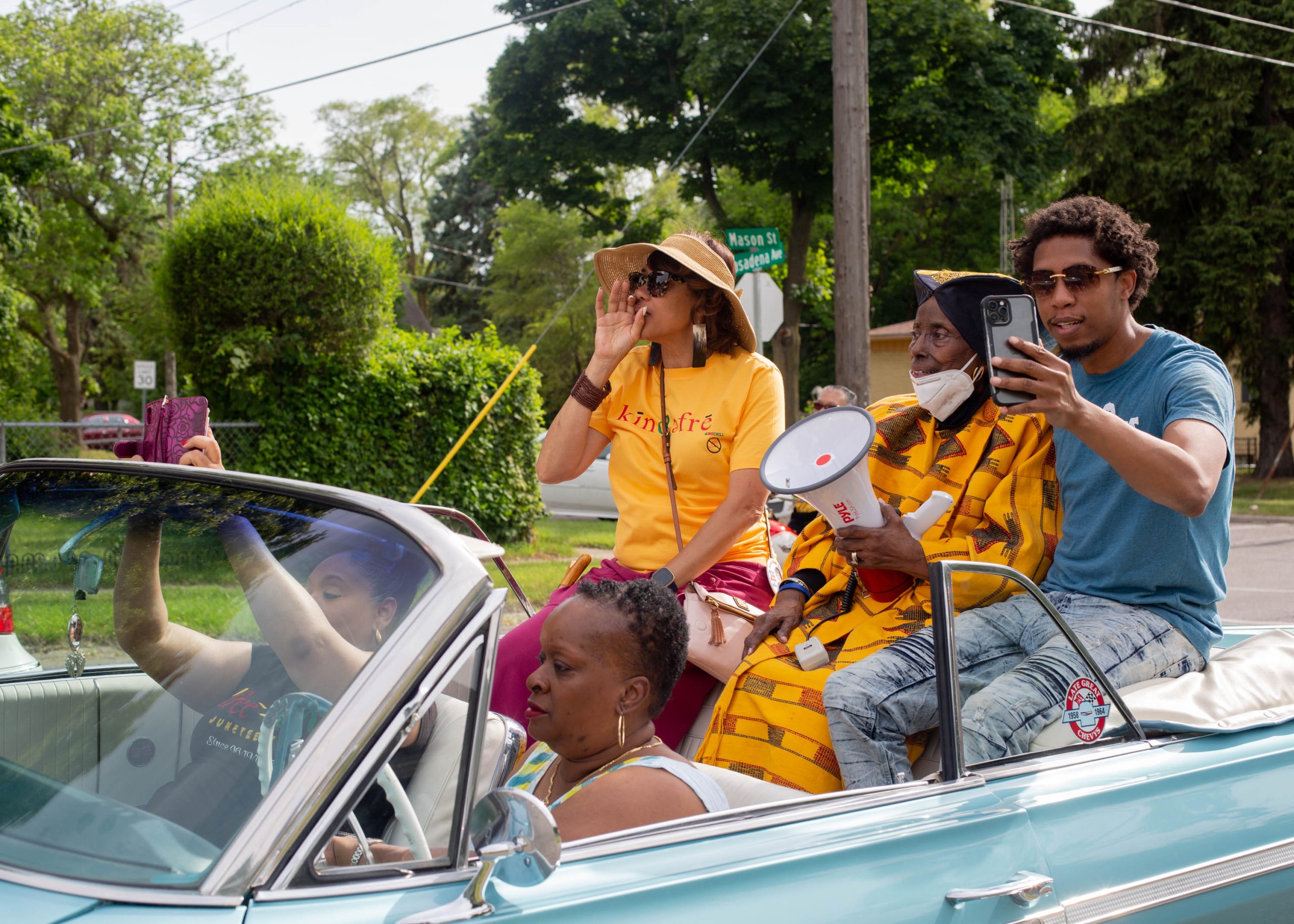 The Kuungana African Drum and Dance Company lead the Juneteenth motorcade from Max Brandon Park to downtown Flint, Mich. on June 19, 2022. (KT Kanazawich | Flint Beat)E. Hill Deloney (back center) helps lead the Juneteenth motorcade from Max Brandon Park to downtown Flint, Mich. on June 19, 2022, alongside Karen Weaver (back left) and City Councilwoman Tonya Burns (front left). (KT Kanazawich | Flint Beat)