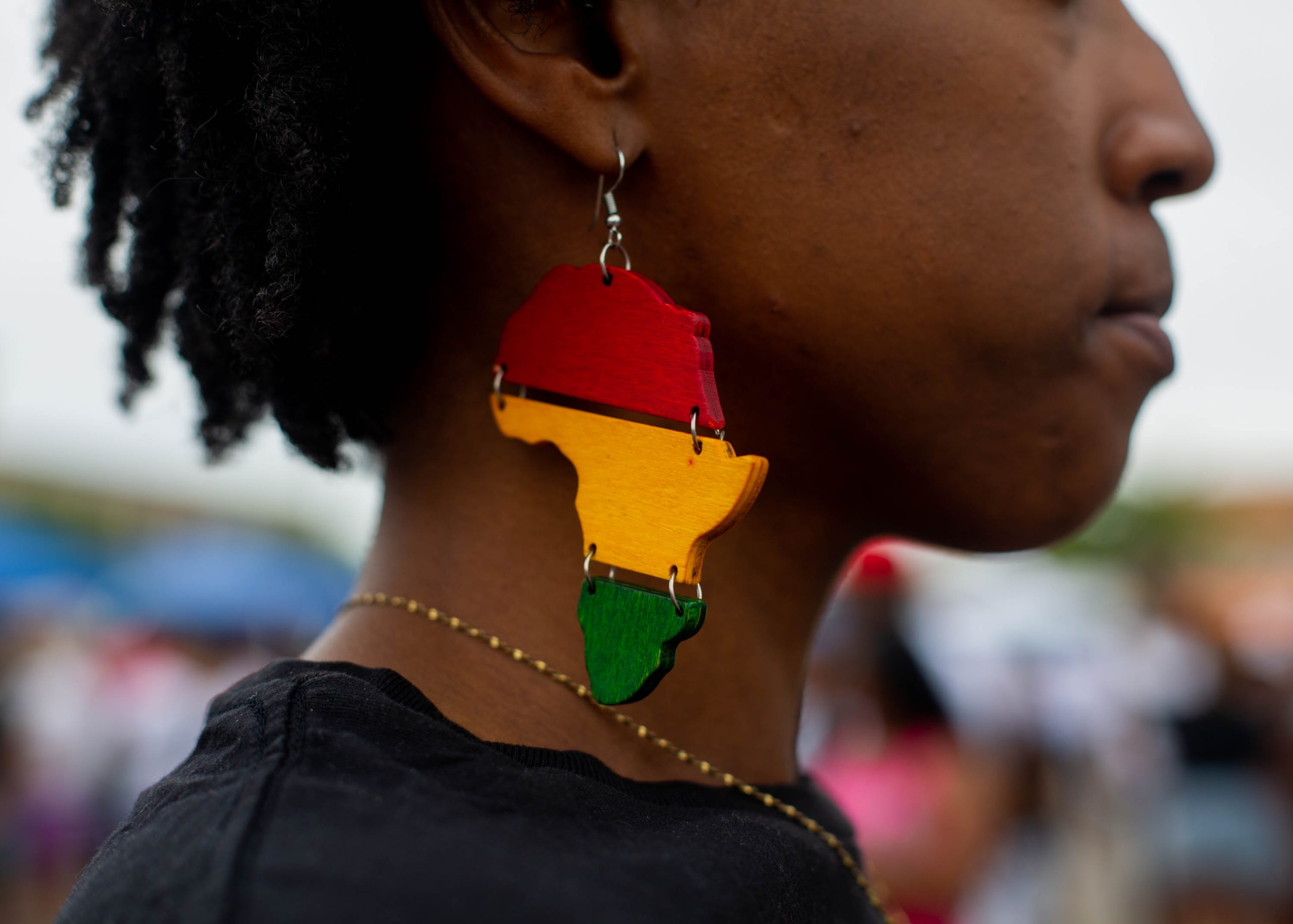 Marquita Adams of Flint shows off her earrings at the Juneteenth Festival in downtown Flint, Mich. on June 19, 2022. (KT Kanazawich | Flint Beat)