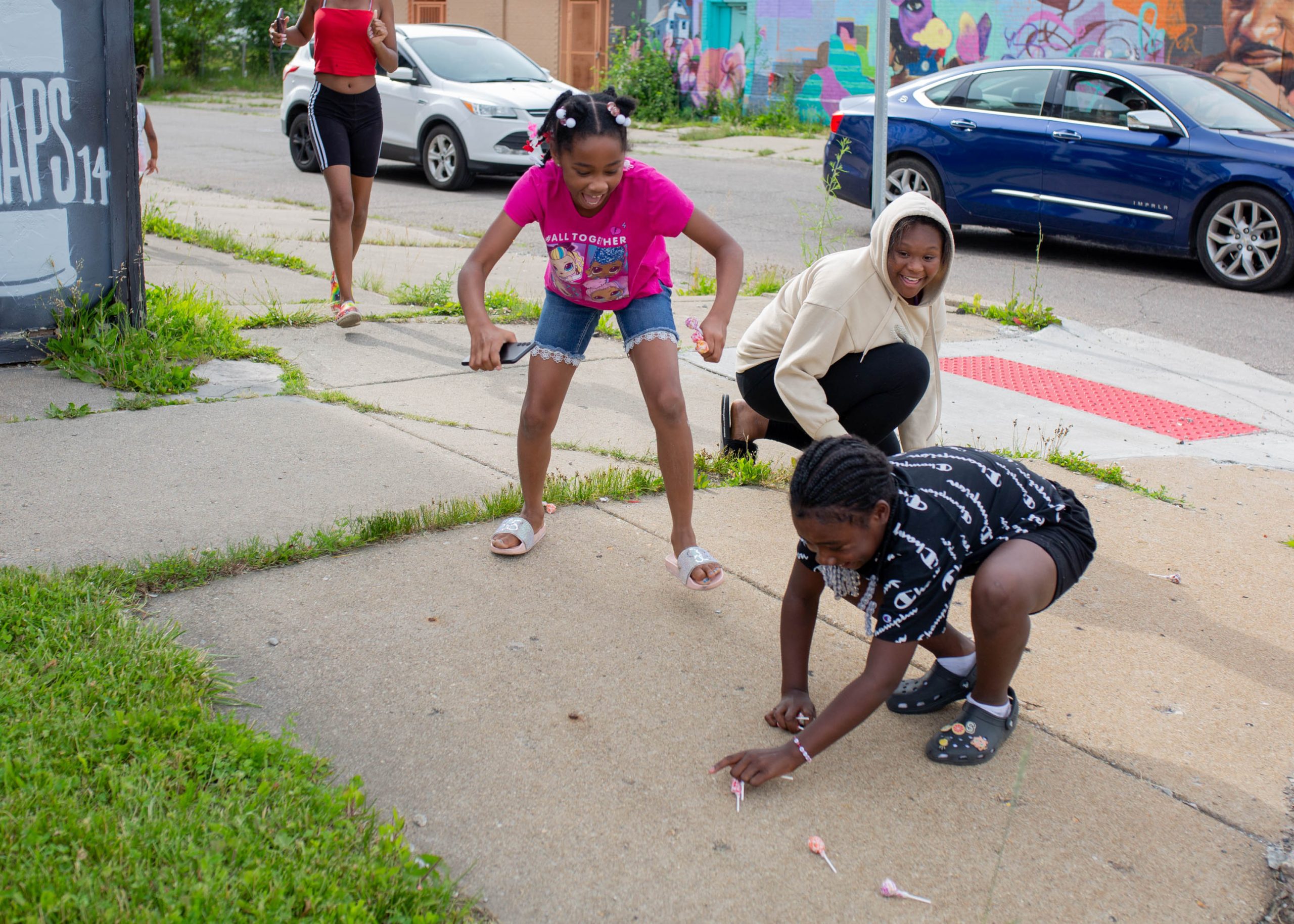 Children run to get candy thrown from the Juneteenth motorcade in Flint, Mich. on June 19, 2022. (KT Kanazawich | Flint Beat)