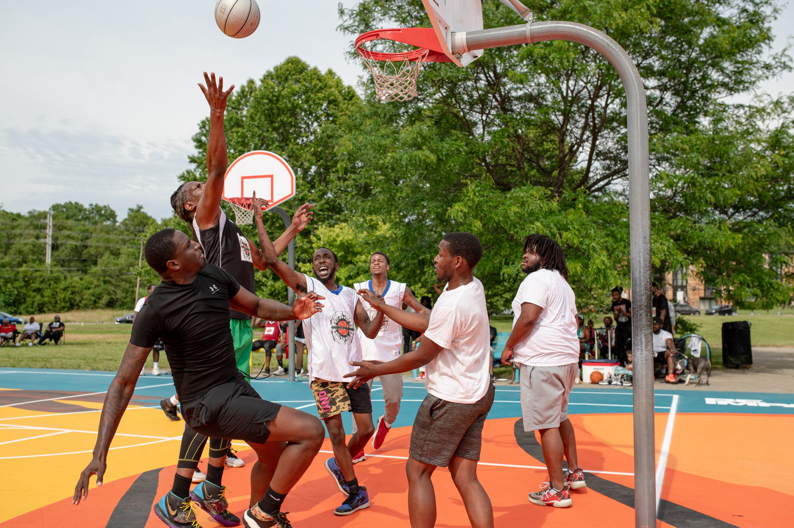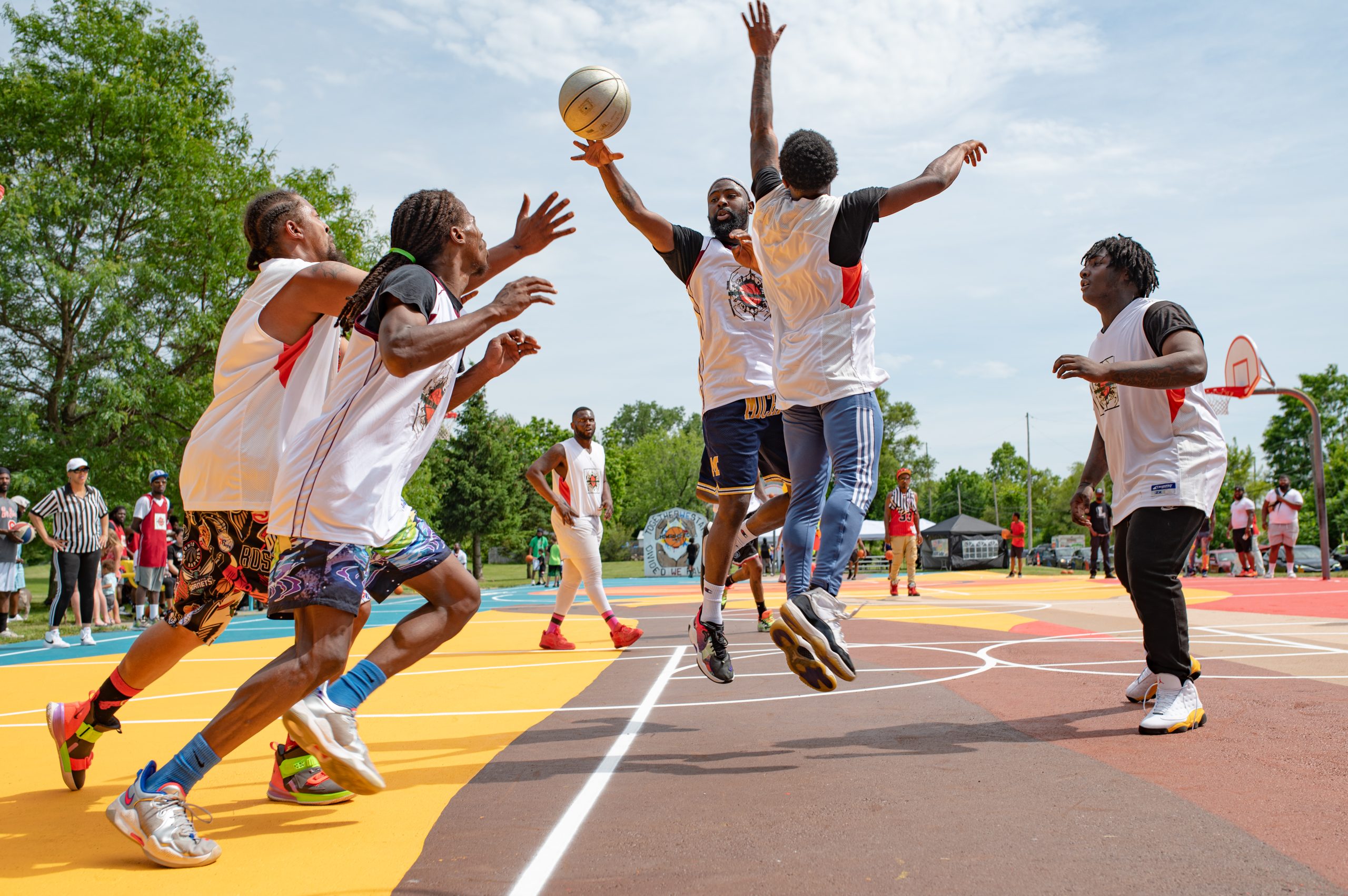 Players compete in the basketball tournament at Howard’s Helping Hands’ 8th Annual Father’s Day and Juneteenth Family Funday at Windiate Park on Flint’s Southside on Sunday, June 19, 2022. The basketball court was recently painted with a mural by Flint artist and entrepreneur Jamiersen Green. Michael Howard, one of the event’s organizers, said he hopes the event carries on the legacy of Vince Robinson, a friend to many in the Flint community who was fatally shot in 2018. This year’s tournament was put on in collaboration with the Detroit Pistons. (Michael Indriolo | Flint Beat)
