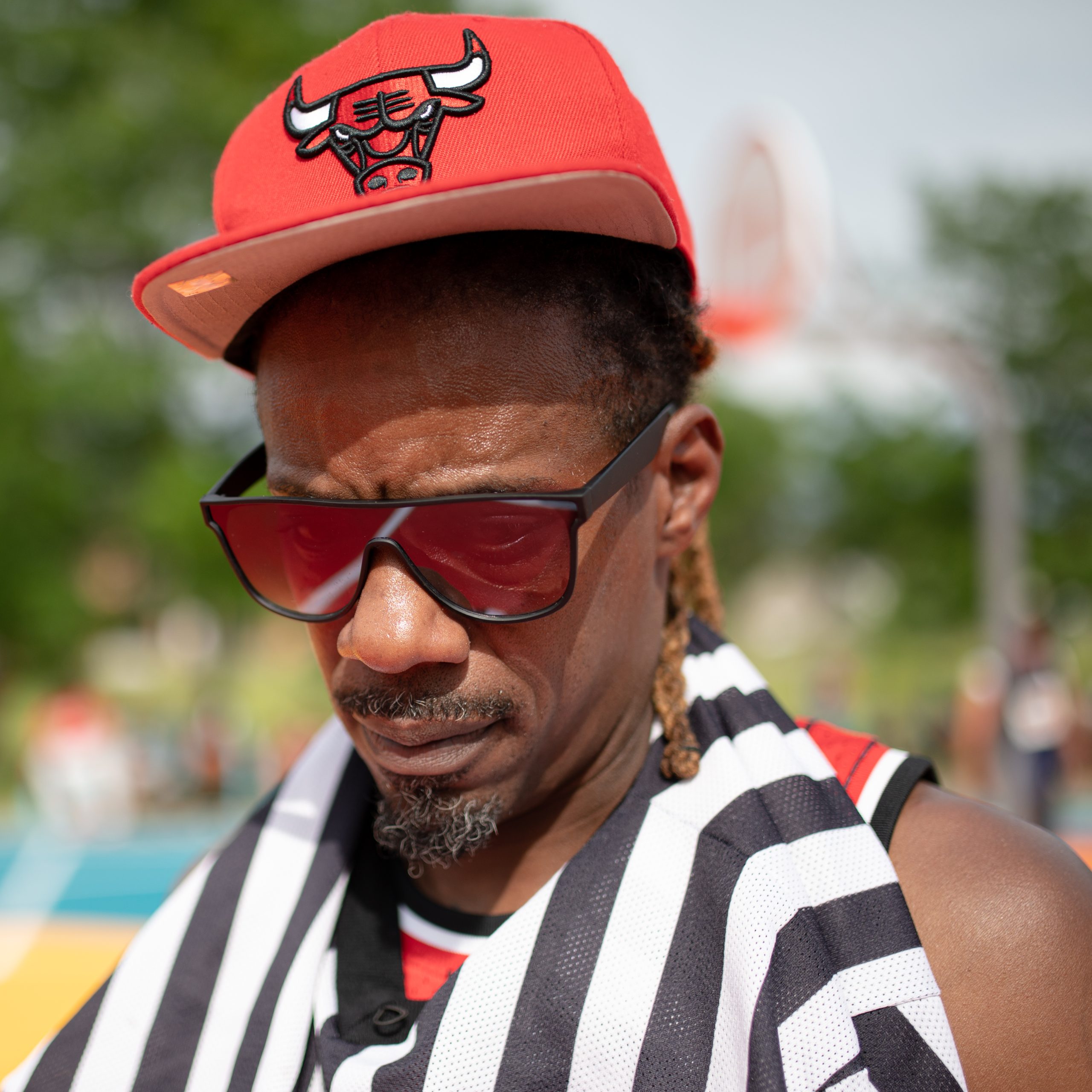 Carldale “Country” Muse poses for a portrait while refereeing the basketball tournament at Howard’s Helping Hands’ 8th Annual Father’s Day and Juneteenth Family Funday at Windiate Park on Flint’s Southside on Sunday, June 19, 2022. The basketball court was recently painted with a mural by Flint artist and entrepreneur Jamiersen Green. Michael Howard, one of the event’s organizers, said he hopes the event carries on the legacy of Vince Robinson, a friend to many in the Flint community who was fatally shot in 2018. This year’s tounrament was put on in collaboration with the Detroit Pistons. (Michael Indriolo | Flint Beat)