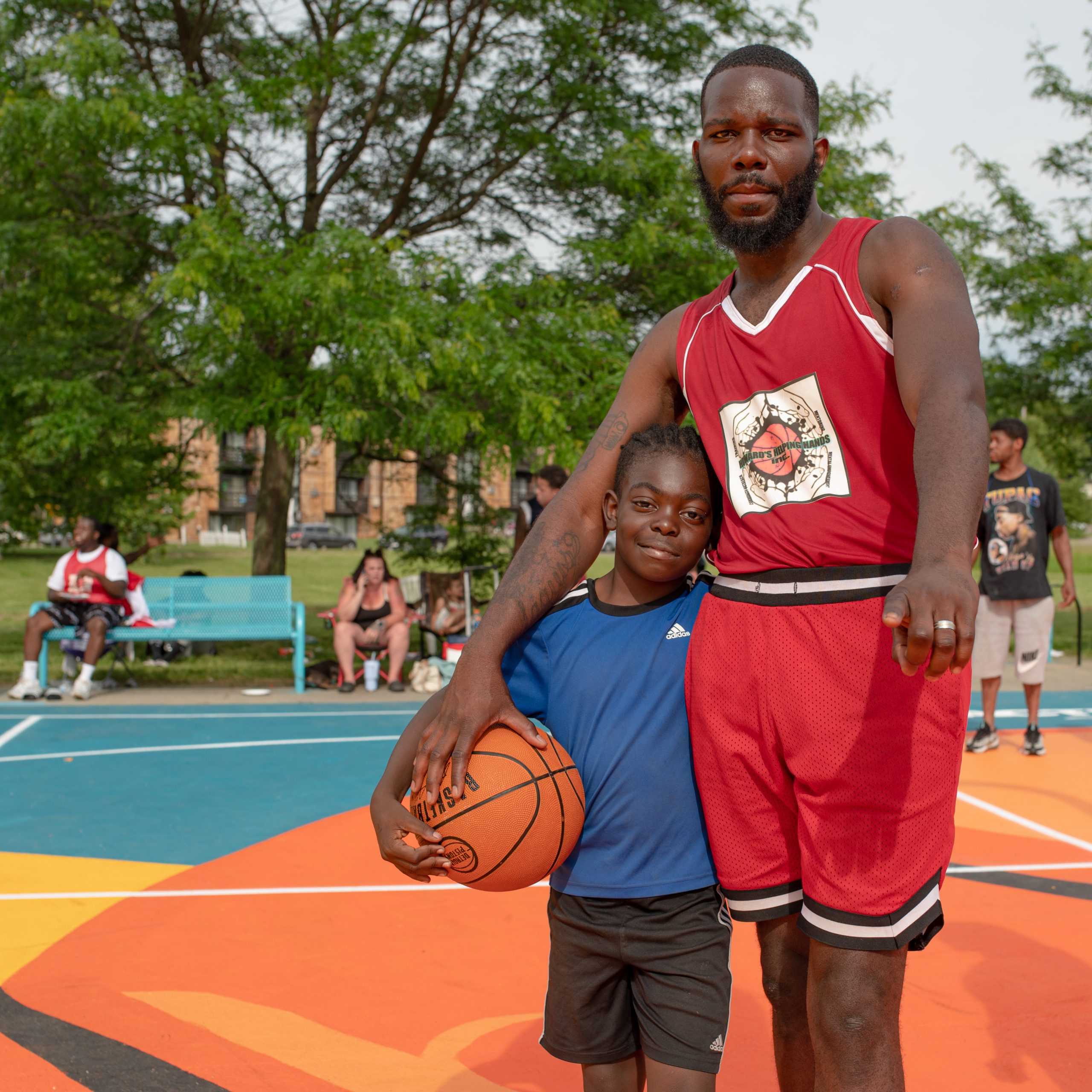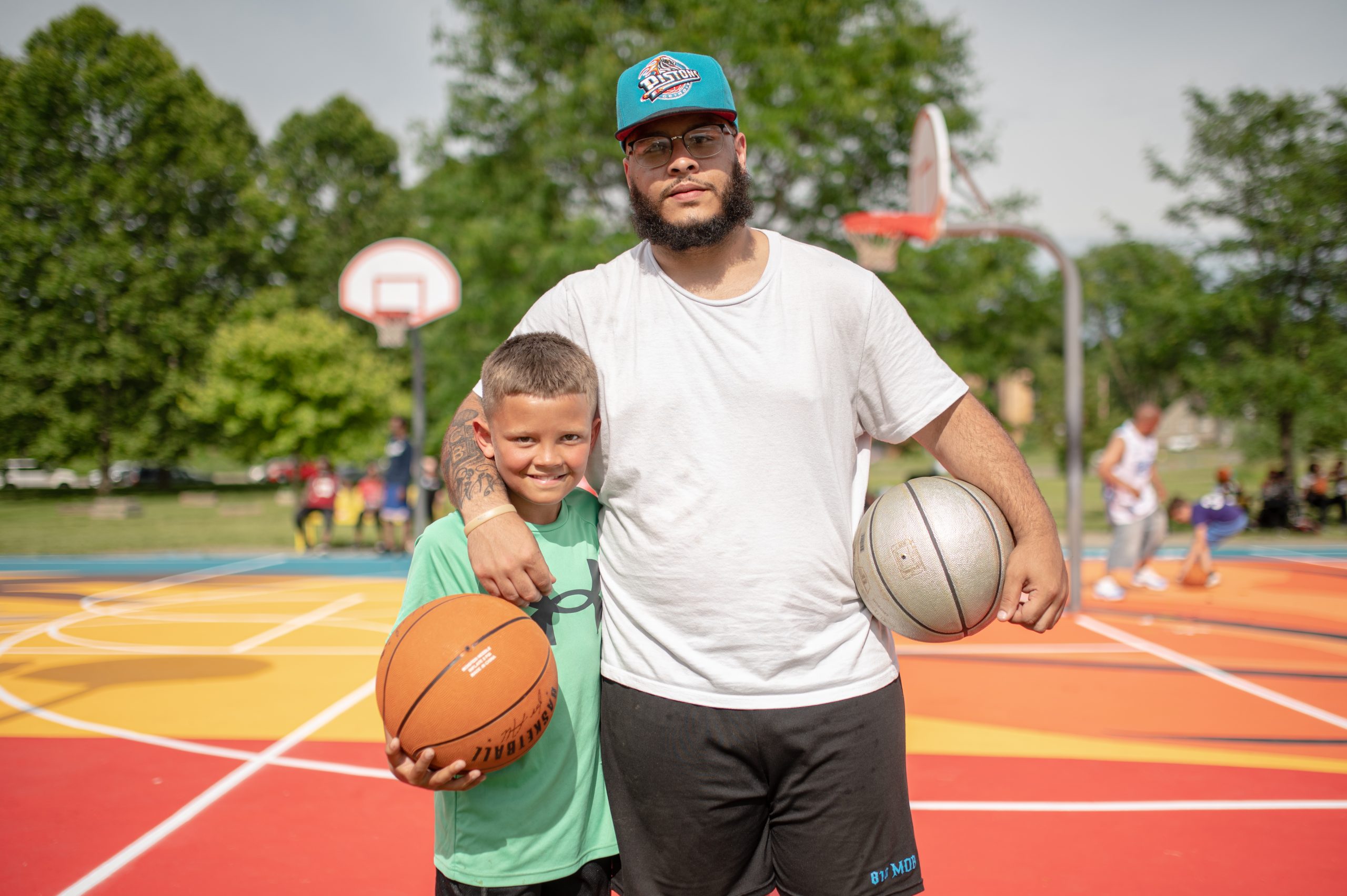 Jacob Dean and Tim Dean pose for a portrait during the basketball tournament at Howard’s Helping Hands’ 8th Annual Father’s Day and Juneteenth Family Funday at Windiate Park on Flint’s Southside on Sunday, June 19, 2022. The basketball court was recently painted with a mural by Flint artist and entrepreneur Jamiersen Green. Michael Howard, one of the event’s organizers, said he hopes the event carries on the legacy of Vince Robinson, a friend to many in the Flint community who was fatally shot in 2018. This year’s tournament was put on in collaboration with the Detroit Pistons. (Michael Indriolo | Flint Beat)