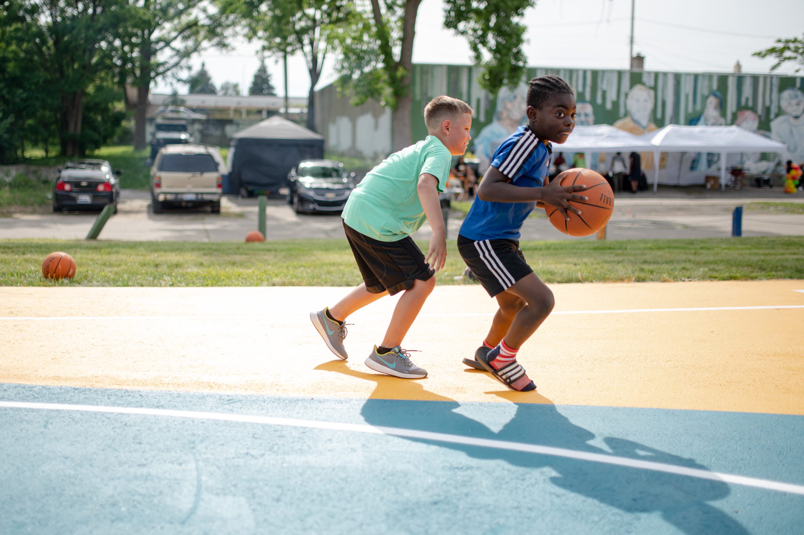 Erion Chalter and Jacob Dean play during the basketball tournament at Howard’s Helping Hands’ 8th Annual Father’s Day and Juneteenth Family Funday at Windiate Park on Flint’s Southside on Sunday, June 19, 2022. The basketball court was recently painted with a mural by Flint artist and entrepreneur Jamiersen Green. Michael Howard, one of the event’s organizers, said he hopes the event carries on the legacy of Vince Robinson, a friend to many in the Flint community who was fatally shot in 2018. This year’s tournament was put on in collaboration with the Detroit Pistons. (Michael Indriolo | Flint Beat)