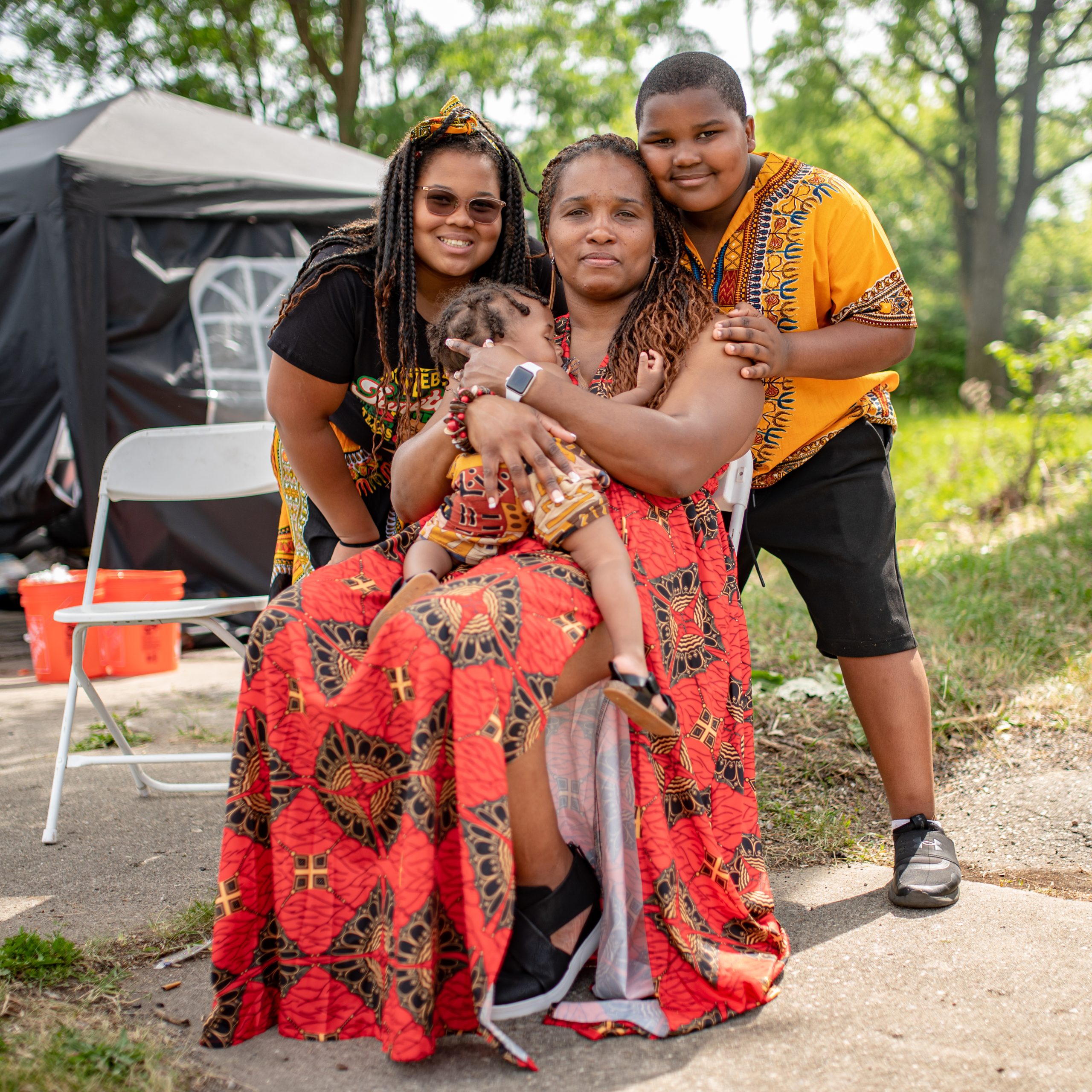 Shareeka Howard, holding Jeremiah Wilson, Michael Howard and Patrice Howard pose for a portrait at Howard’s Helping Hands’ 8th Annual Father’s Day and Juneteenth Family Funday at Windiate Park on Flint’s Southside on Sunday, June 19, 2022. The basketball court was recently painted with a mural by Flint artist and entrepreneur Jamiersen Green. Michael Howard, Sr., one of the event’s organizers, said he hopes the event carries on the legacy of Vince Robinson, a friend to many in the Flint community who was fatally shot in 2018. This year’s tournament was put on in collaboration with the Detroit Pistons. (Michael Indriolo | Flint Beat)