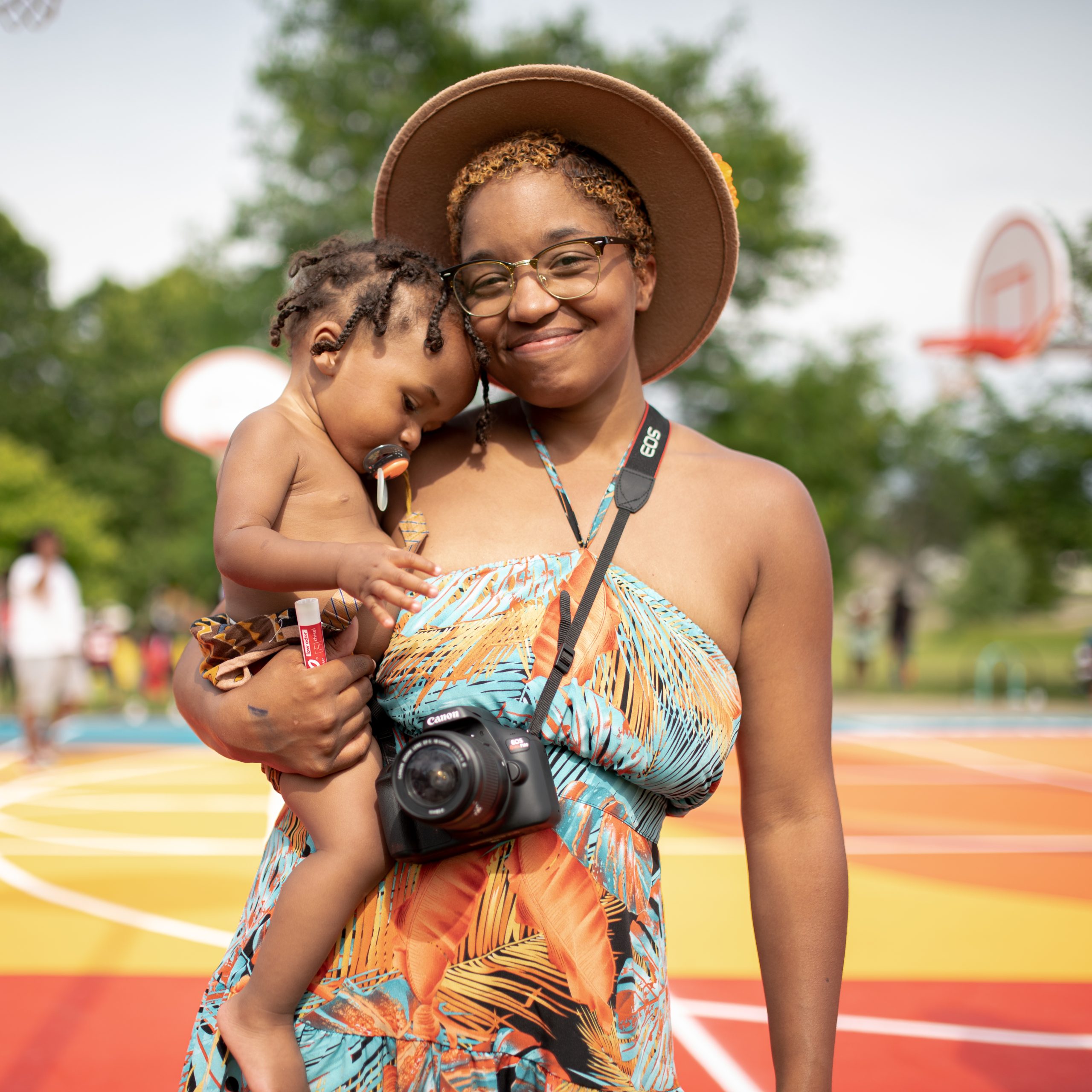 Shiann Howard poses for a portrait with her son Jeremiah Wilson during the basketball tournament at Howard’s Helping Hands’ 8th Annual Father’s Day and Juneteenth Family Funday at Windiate Park on Flint’s Southside on Sunday, June 19, 2022. The basketball court was recently painted with a mural by Flint artist and entrepreneur Jamiersen Green. Michael Howard, one of the event’s organizers, said he hopes the event carries on the legacy of Vince Robinson, a friend to many in the Flint community who was fatally shot in 2018. This year’s tournament was put on in collaboration with the Detroit Pistons. (Michael Indriolo | Flint Beat)