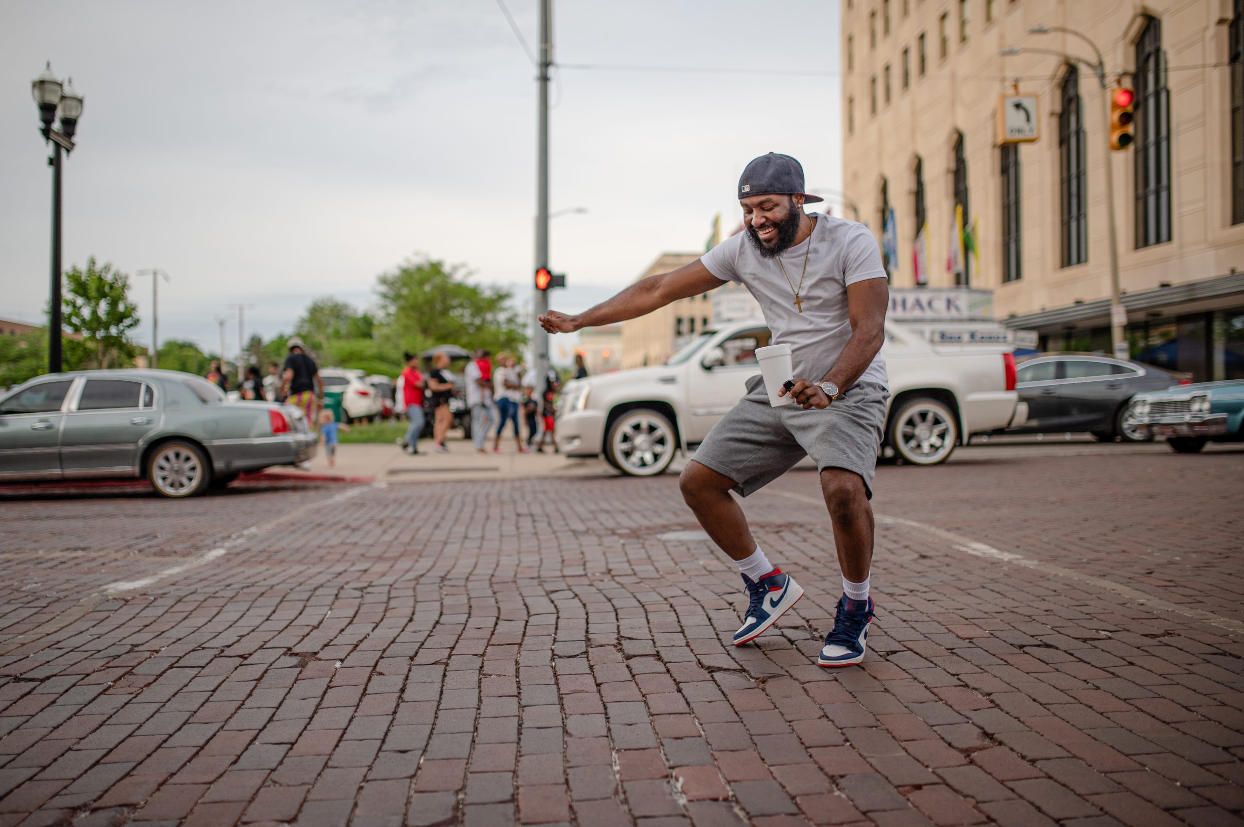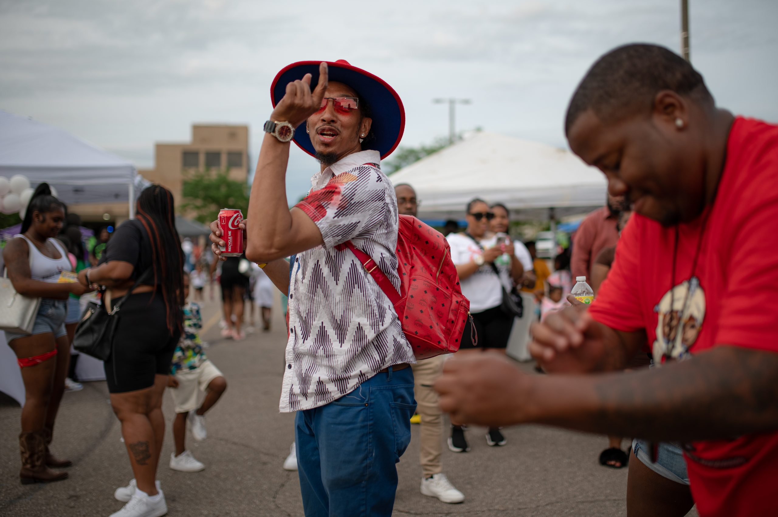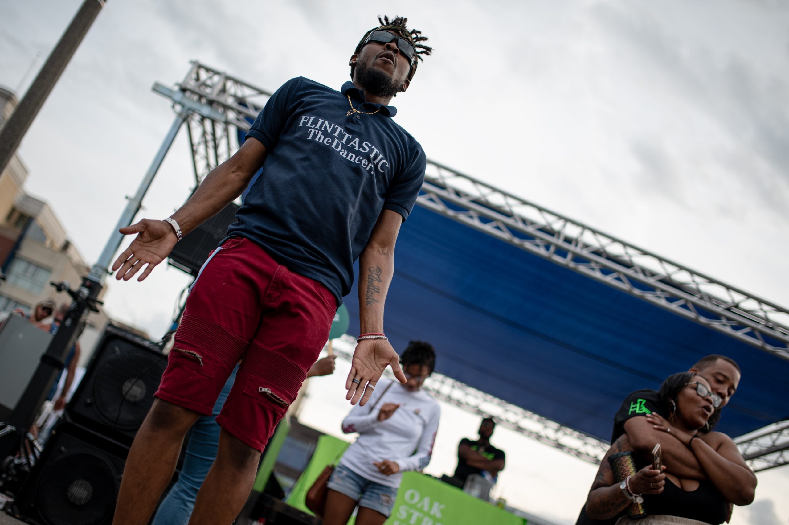 Flint promoter Toeknee dances on Saginaw Street outside Flint’s Downtown Flat Lot on Sunday, June 19, 2022. Vendors and residents gathered in the Flat Lot for Flint’s Third Annual Juneteenth Festival presented by Kerale C. (Michael Indriolo | Flint Beat)