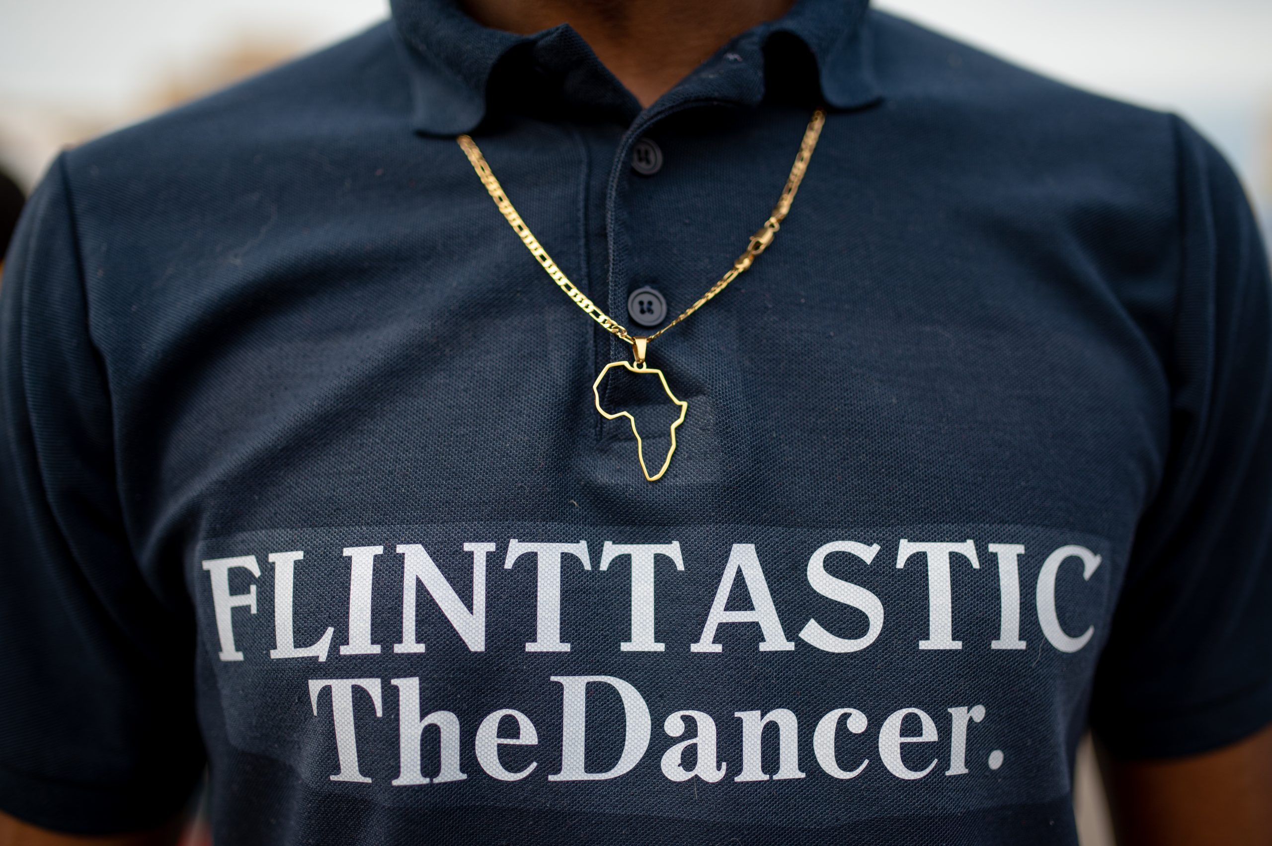 Local dancer Steven Smith, who goes by the moniker Flinttastic the Dancer, shows his shirt and necklace during Flint’s Third Annual Juneteenth Festival presented by Kerale C in the Downtown Flat Lot on Sunday, June 19, 2022. (Michael Indriolo | Flint Beat)