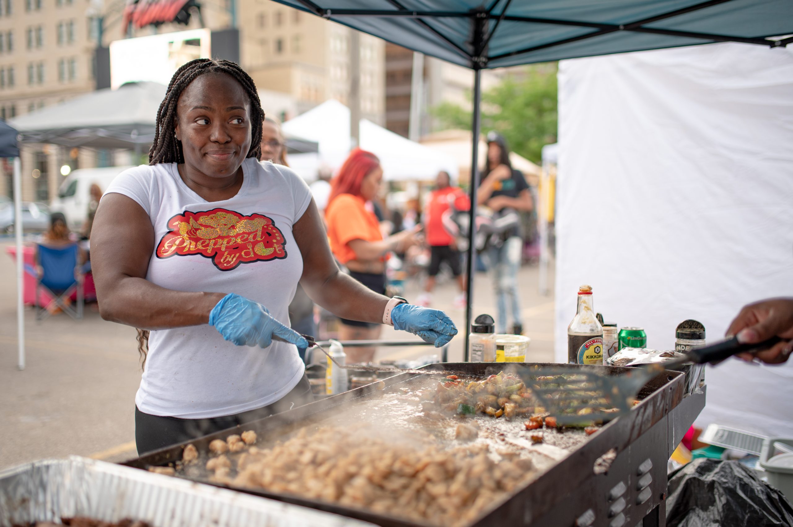 LaQuindra Cooper, who runs a catering business called Prepped by Dot, cooks hibachi during Flint’s Third Annual Juneteenth Festival presented by Kerale C in the Downtown Flat Lot on Sunday, June 19, 2022. (Michael Indriolo | Flint Beat)