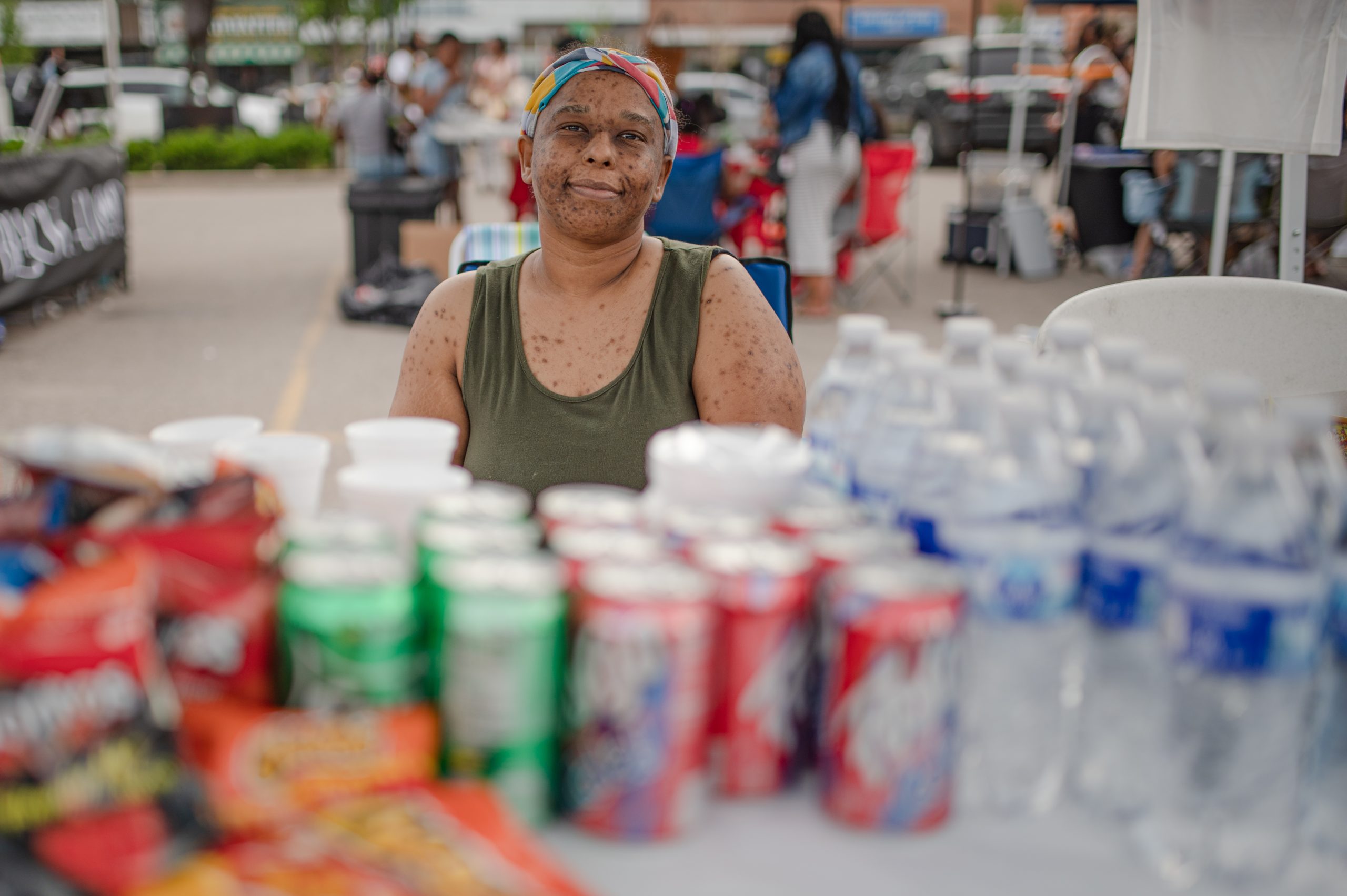 Latoya Nettles poses for a portrait with snacks and sodas she sold during Flint’s Third Annual Juneteenth Festival presented by Kerale C in the Downtown Flat Lot on Sunday, June 19, 2022. (Michael Indriolo | Flint Beat)