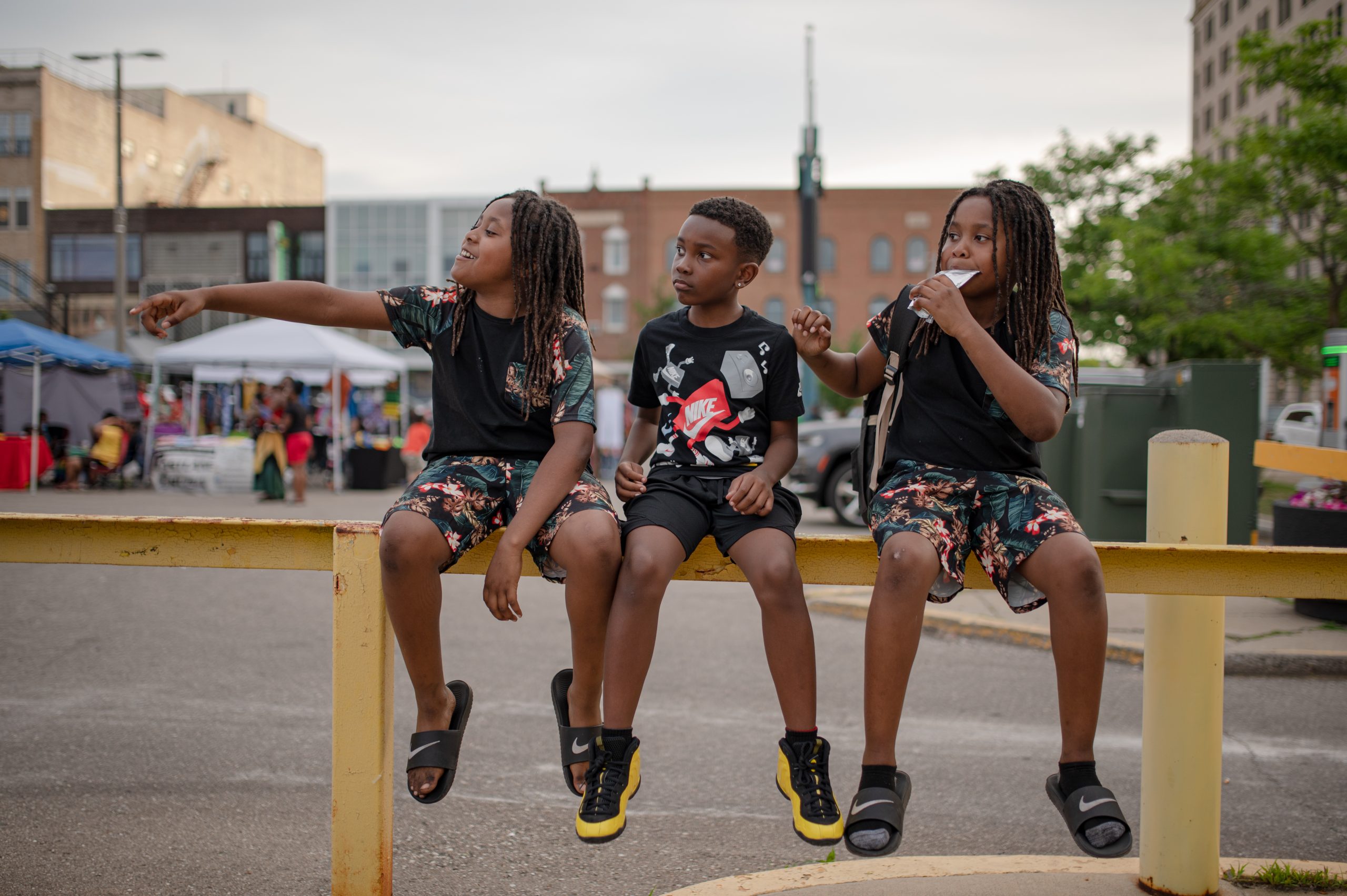 Twins Ramani Robinson and Ramello Robinson sit on a guard rail with their friend Tylan Curry during Flint’s Third Annual Juneteenth Festival presented by Kerale C in the Downtown Flat Lot on Sunday, June 19, 2022. (Michael Indriolo | Flint Beat)