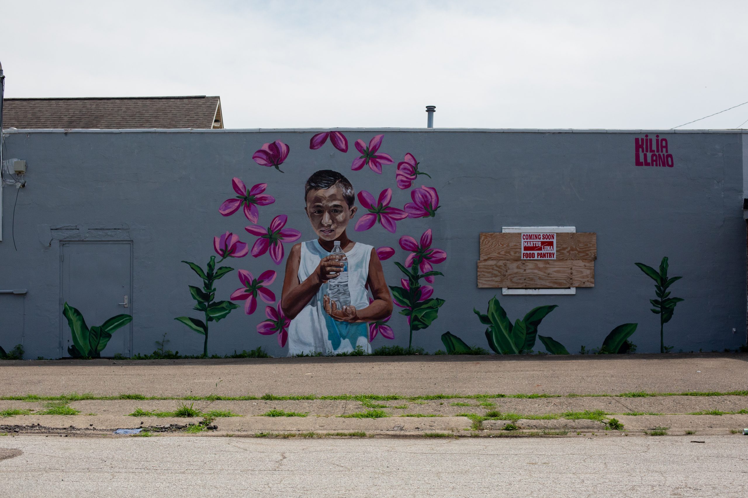 That same week, Dominican artist Kilia Llano adorned the side of the new Martus Luna Food Pantry building on Fenton Road with the image of a Latinx Flint child holding a bottle of water, alluding to the Flint Water crisis and the toll it took on children.
