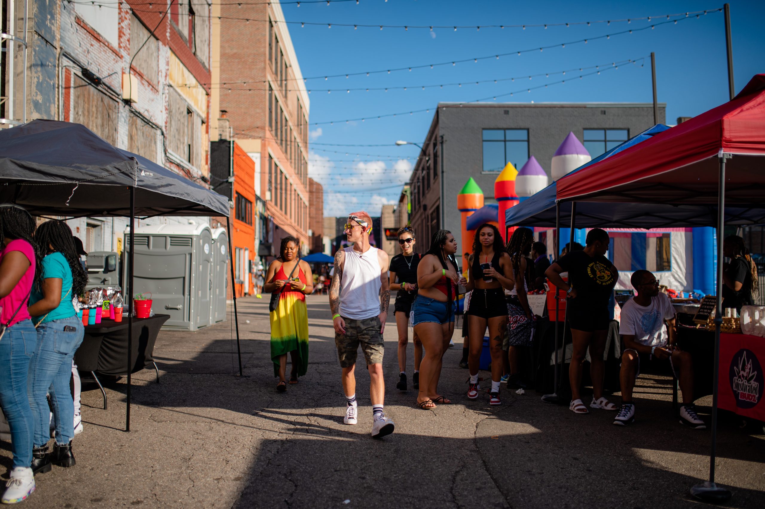 Zai Moett, Maranda Levels and Ayanna Thompson pose for a portrait during Glizzy Fest in Downtown Flint, Mich. on August 6, 2022. (Michael Indriolo | Flint Beat)Indica the dog rests in the shade during Glizzy Fest in Downtown Flint, Mich. on August 6, 2022. (Michael Indriolo | Flint Beat)GMB Leni and Prezidential P open up a barricade to let festival attendees in during Glizzy Fest in Downtown Flint, Mich. on August 6, 2022. (Michael Indriolo | Flint Beat)