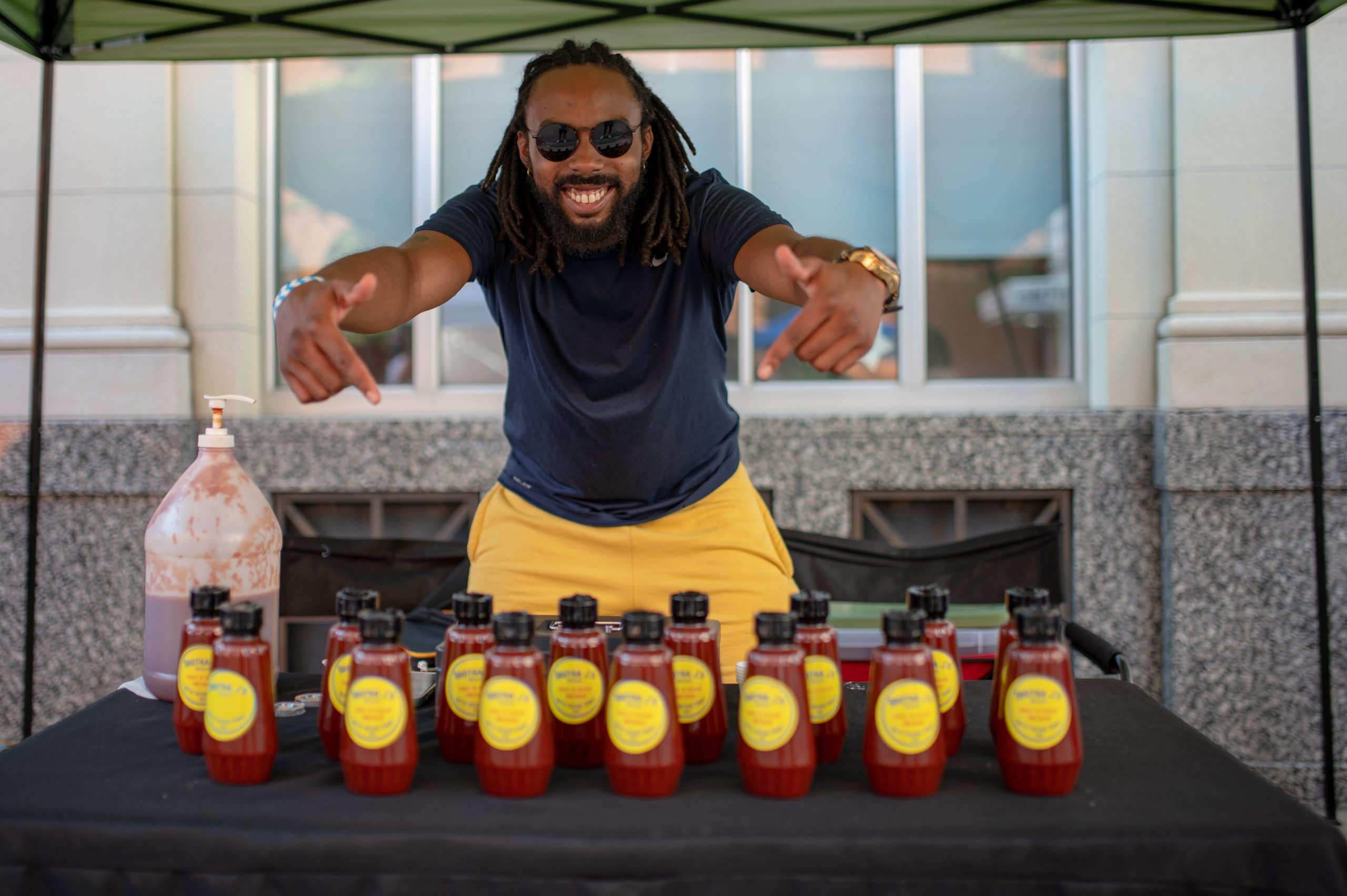 Jonathan Davis, founder of Brotha J’s BBQ, points toward bottles of his signature barbecue sauces during Glizzy Fest in Downtown Flint, Mich. on August 6, 2022. (Michael Indriolo | Flint Beat)