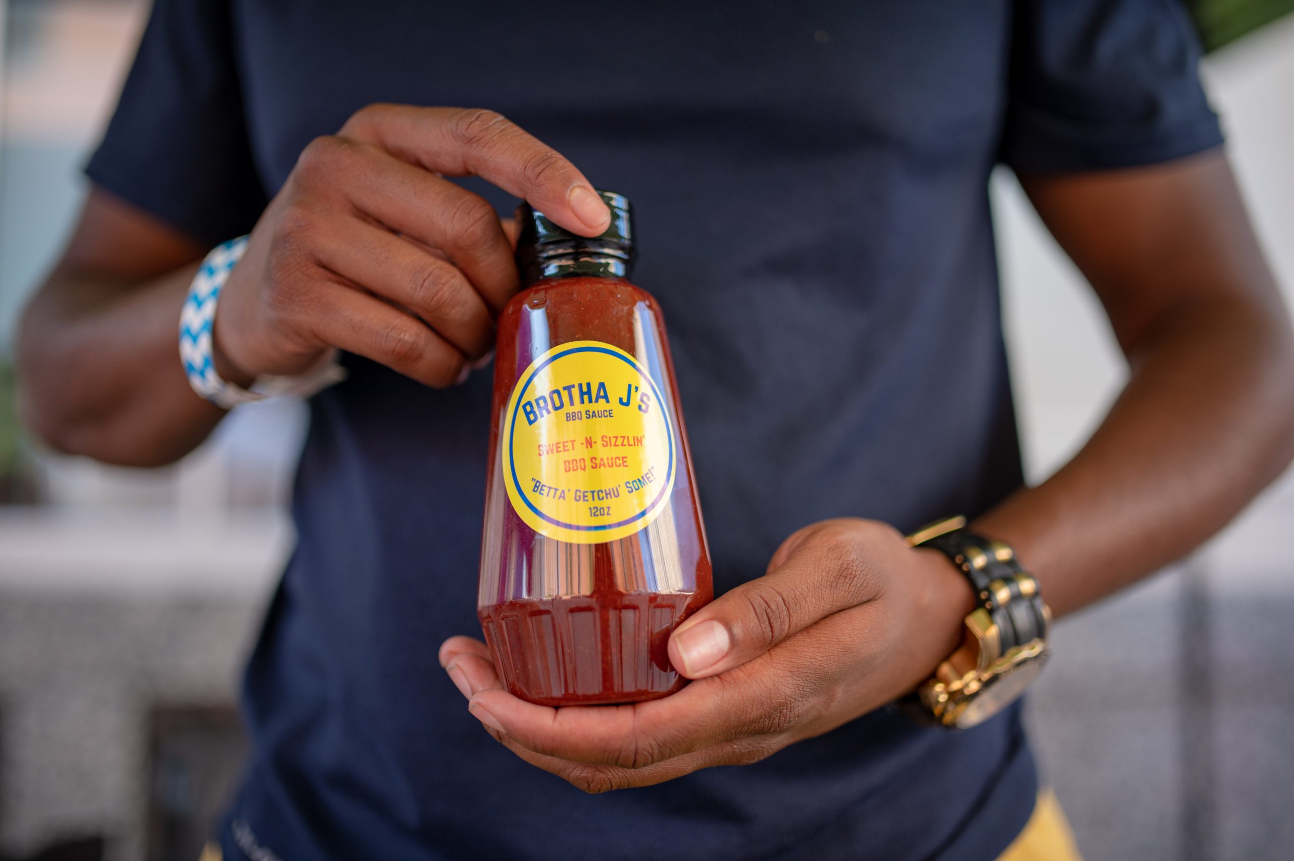 Jonathan Davis, founder of Brotha J’s BBQ, holds a bottle of his signature barbecue sauces during Glizzy Fest in Downtown Flint, Mich. on August 6, 2022. (Michael Indriolo | Flint Beat)