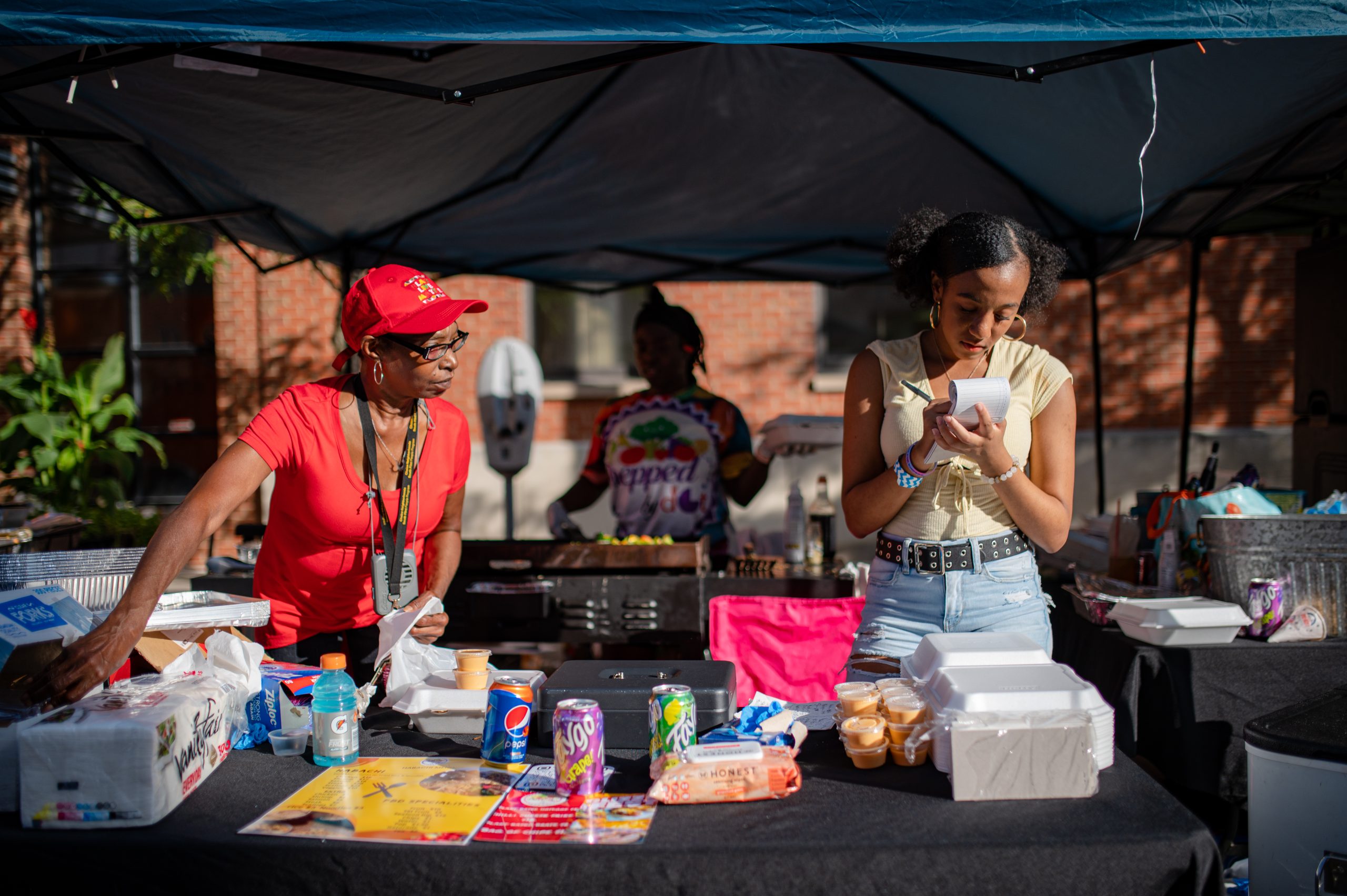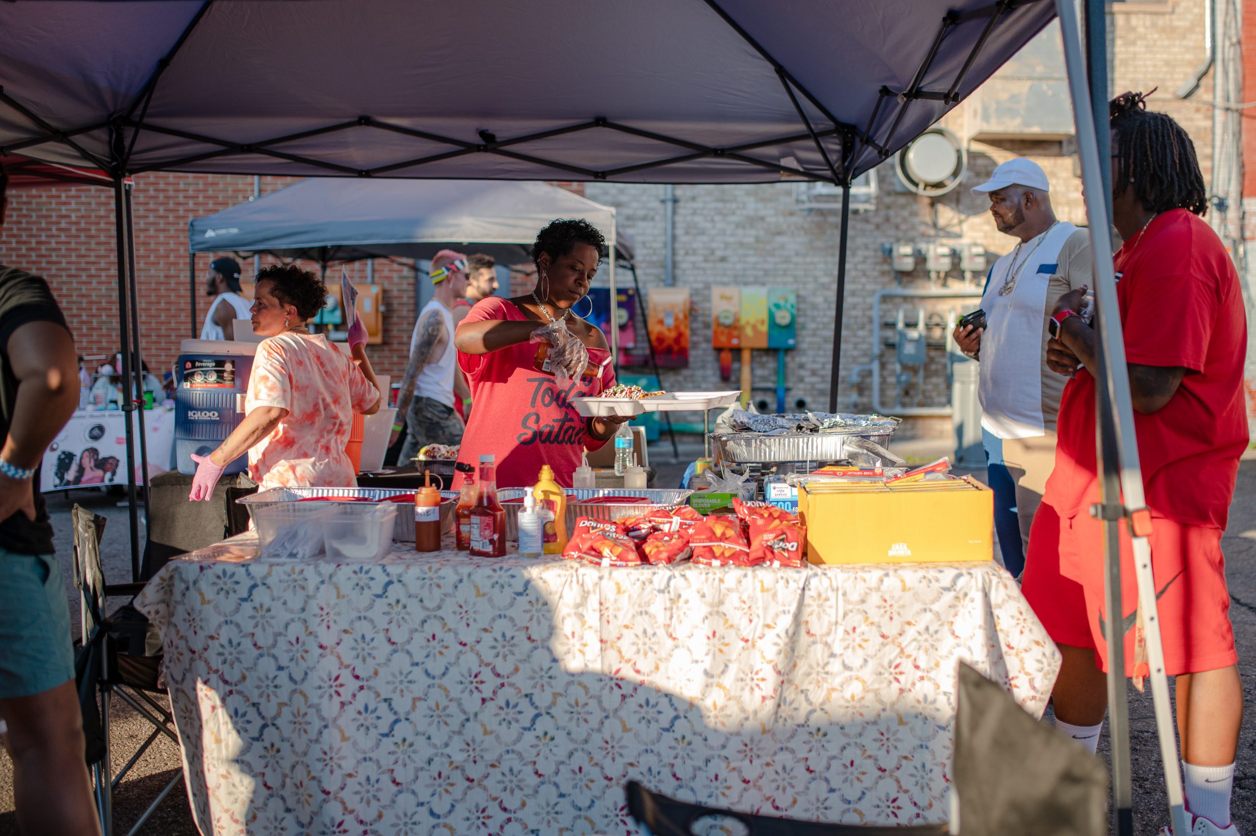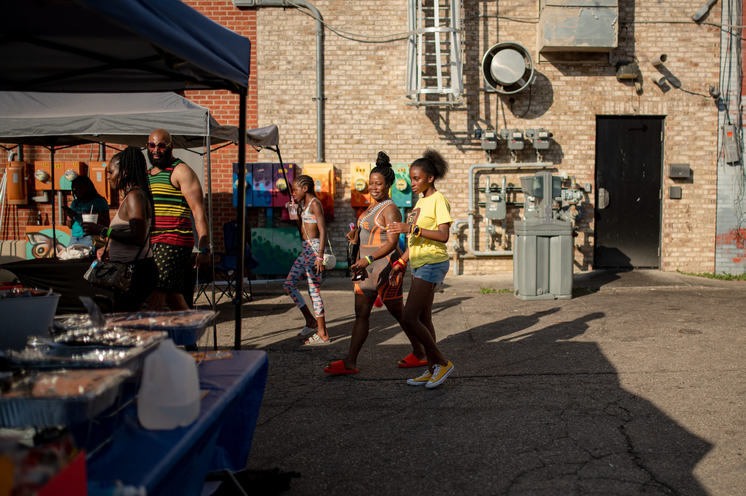 Glizzy Fest attendees walk down Buckham Alley in Downtown Flint, Mich. on August 6, 2022. (Michael Indriolo | Flint Beat)Pearl Brown, Zuriah McMillian and LaQuindra Cooper prepare hibachi orders from their catering company Prepped By Dot during Glizzy Fest in Downtown Flint, Mich. on August 6, 2022. (Michael Indriolo | Flint Beat)