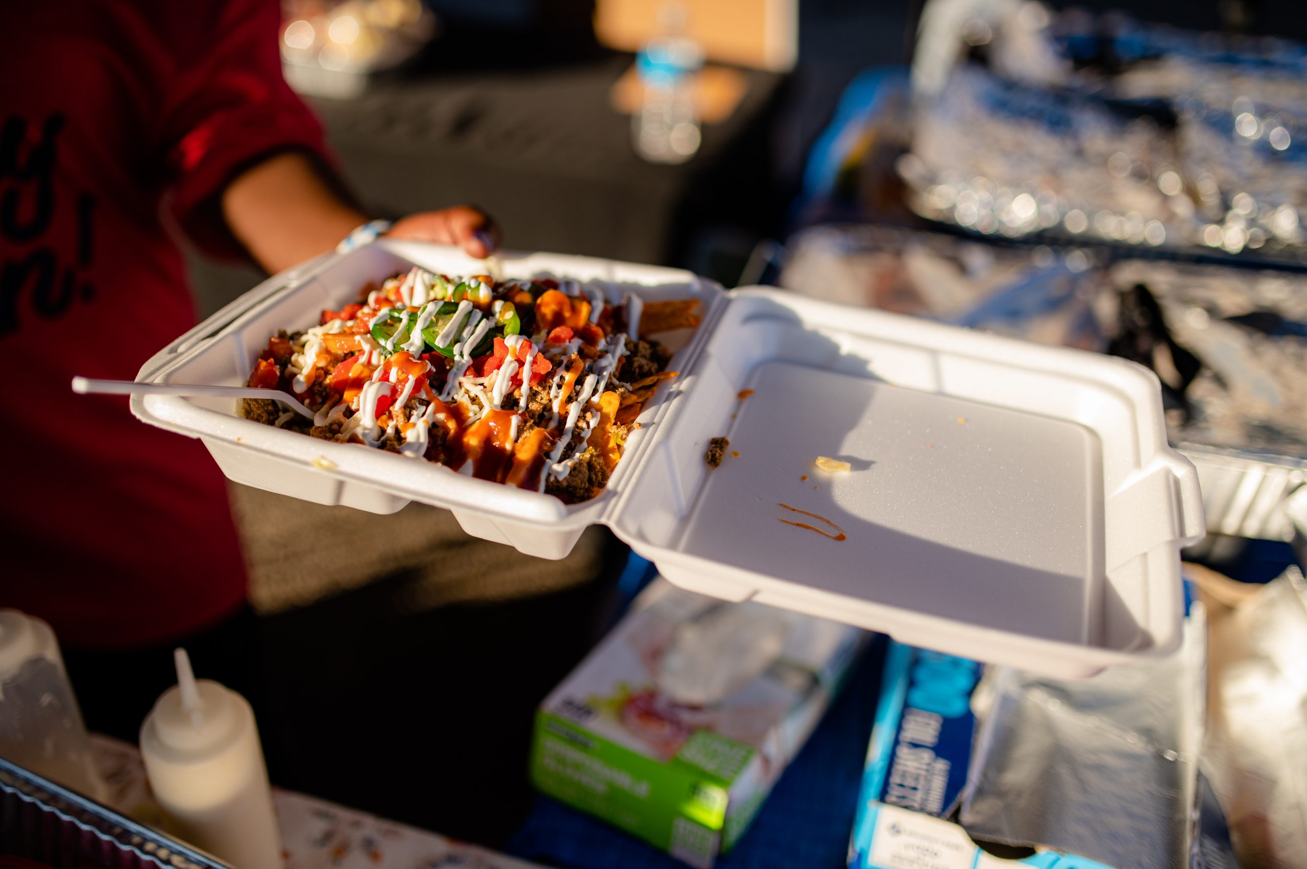Prudence Dom-Martin prepares a plate of loaded nachos at Twany Lo’s Tacos during Glizzy Fest in Downtown Flint, Mich. on August 6, 2022. (Michael Indriolo | Flint Beat)