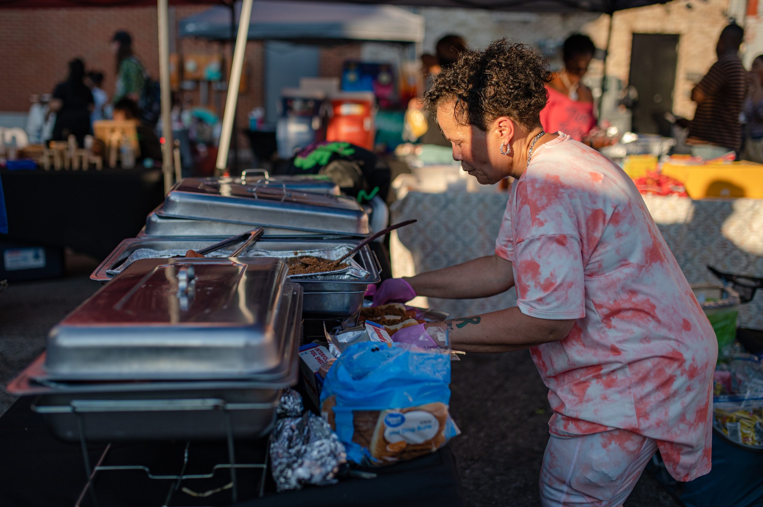 Lynne Hampton, who owns her own food business called Lunch with Lynne, prepares two coneys during Glizzy Fest in Downtown Flint, Mich. on August 6, 2022. (Michael Indriolo | Flint Beat)