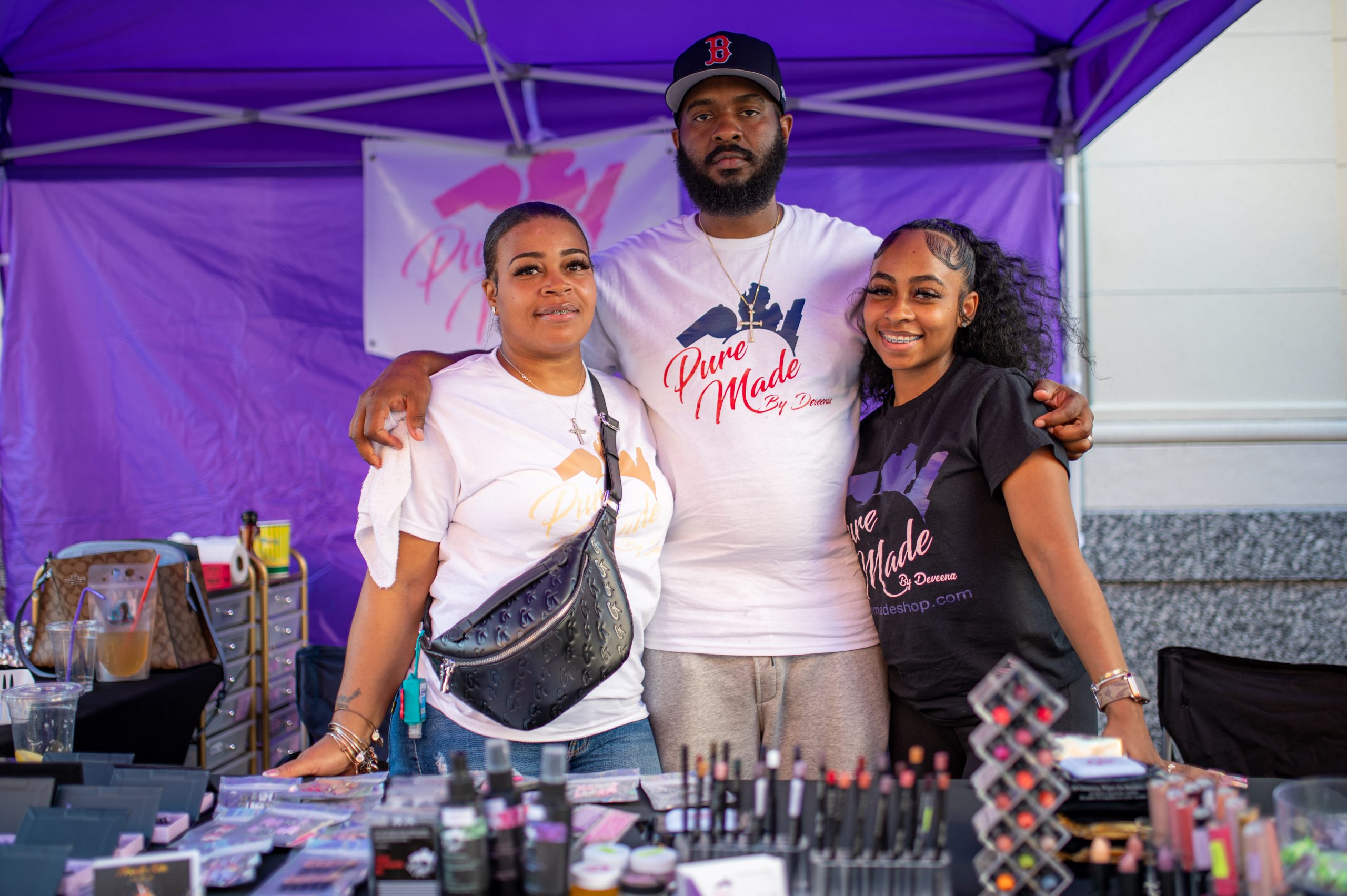Daveena James, owner of the beauty products shop Pure Made By Daveena, poses for a portrait with Demarco James and Shayla Jourdan during Glizzy Fest in Downtown Flint, Mich. on August 6, 2022. (Michael Indriolo | Flint Beat)