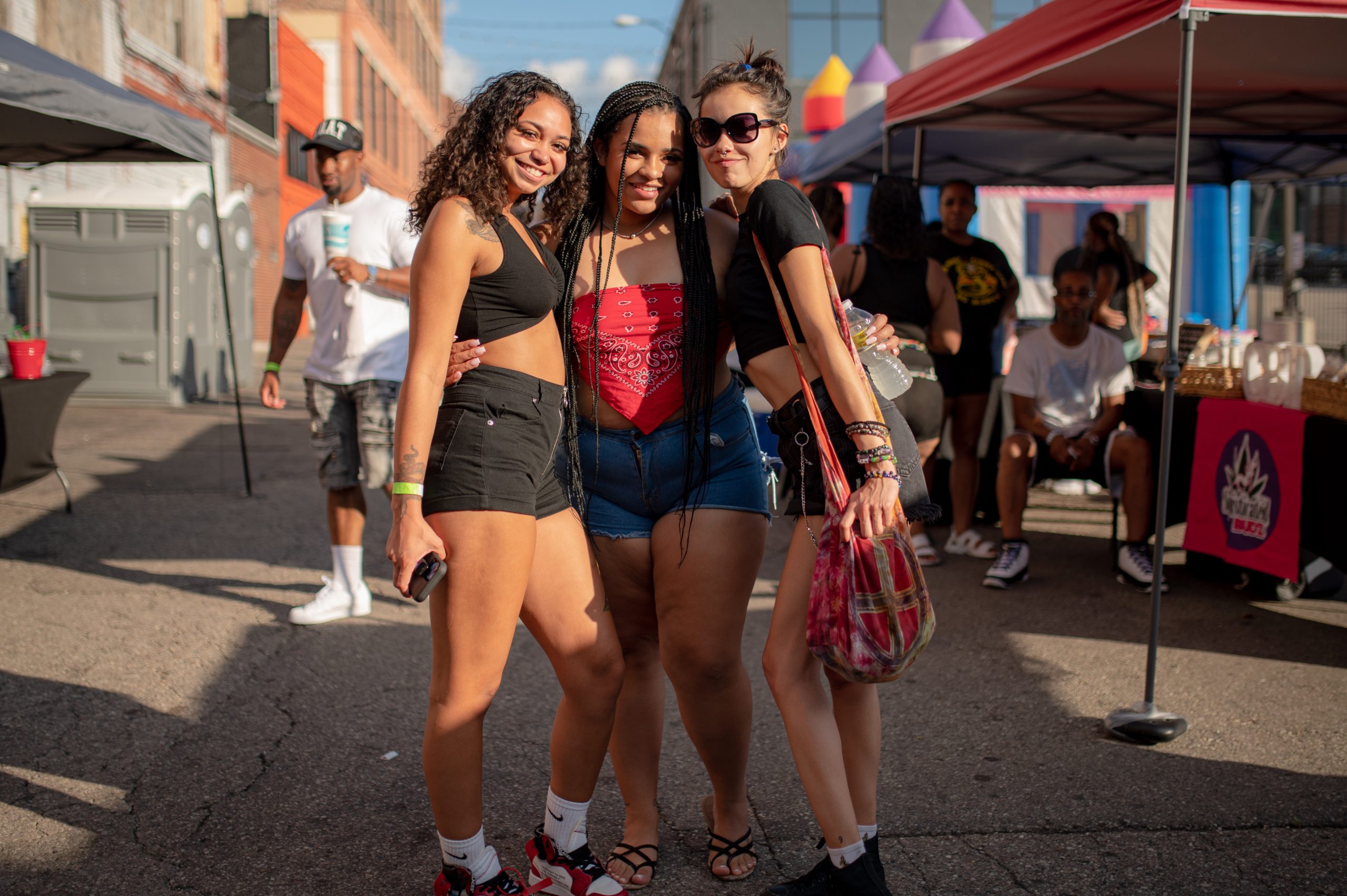 DJ Updoe, a DJ for Flint-based rapper Louie Ray and 98.9 The Beat, Jay Durty, an on-air personality at 98.9 The Beat and owner of Distressed Hearts Clothing & Apparel, and Melly pose for a portrait during Glizzy Fest in Downtown Flint, Mich. on August 6, 2022. (Michael Indriolo | Flint Beat)