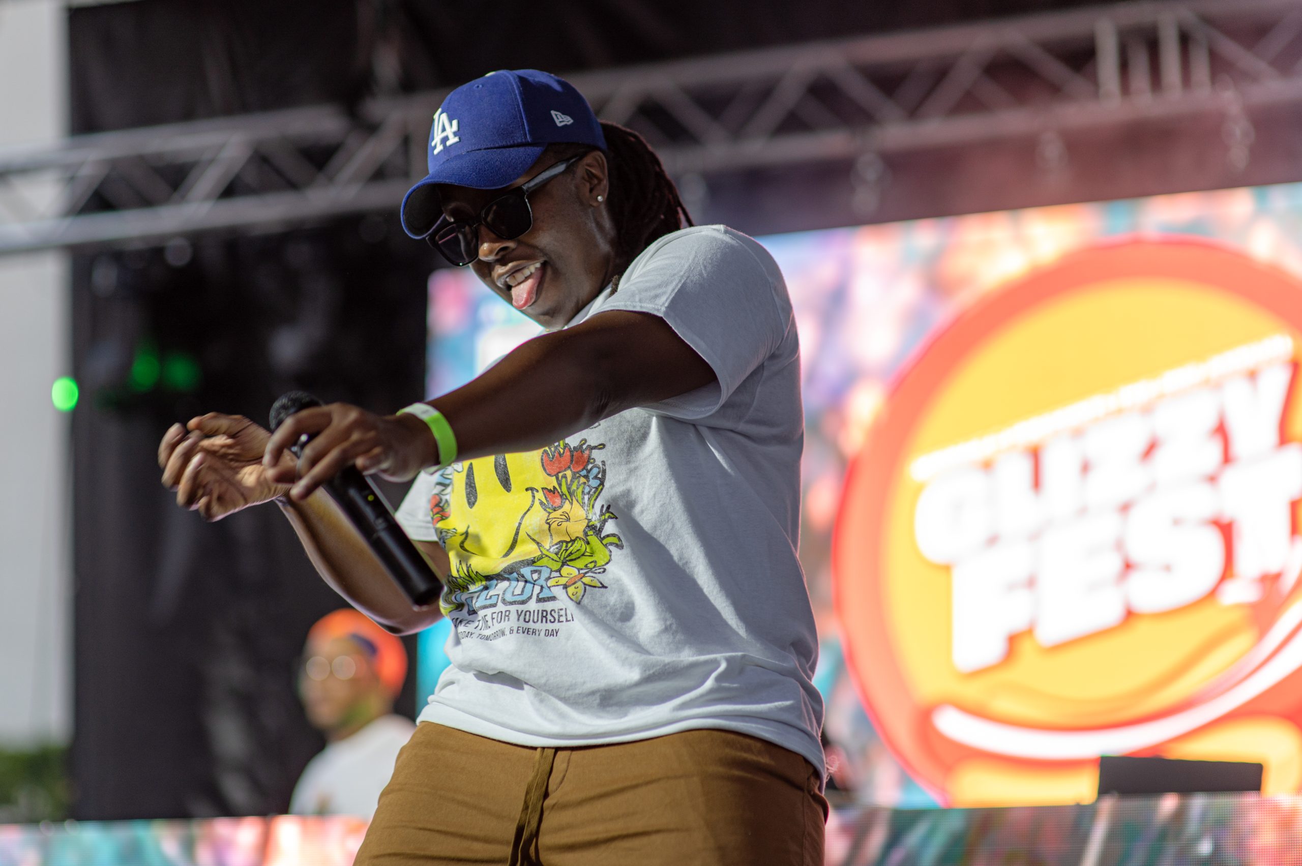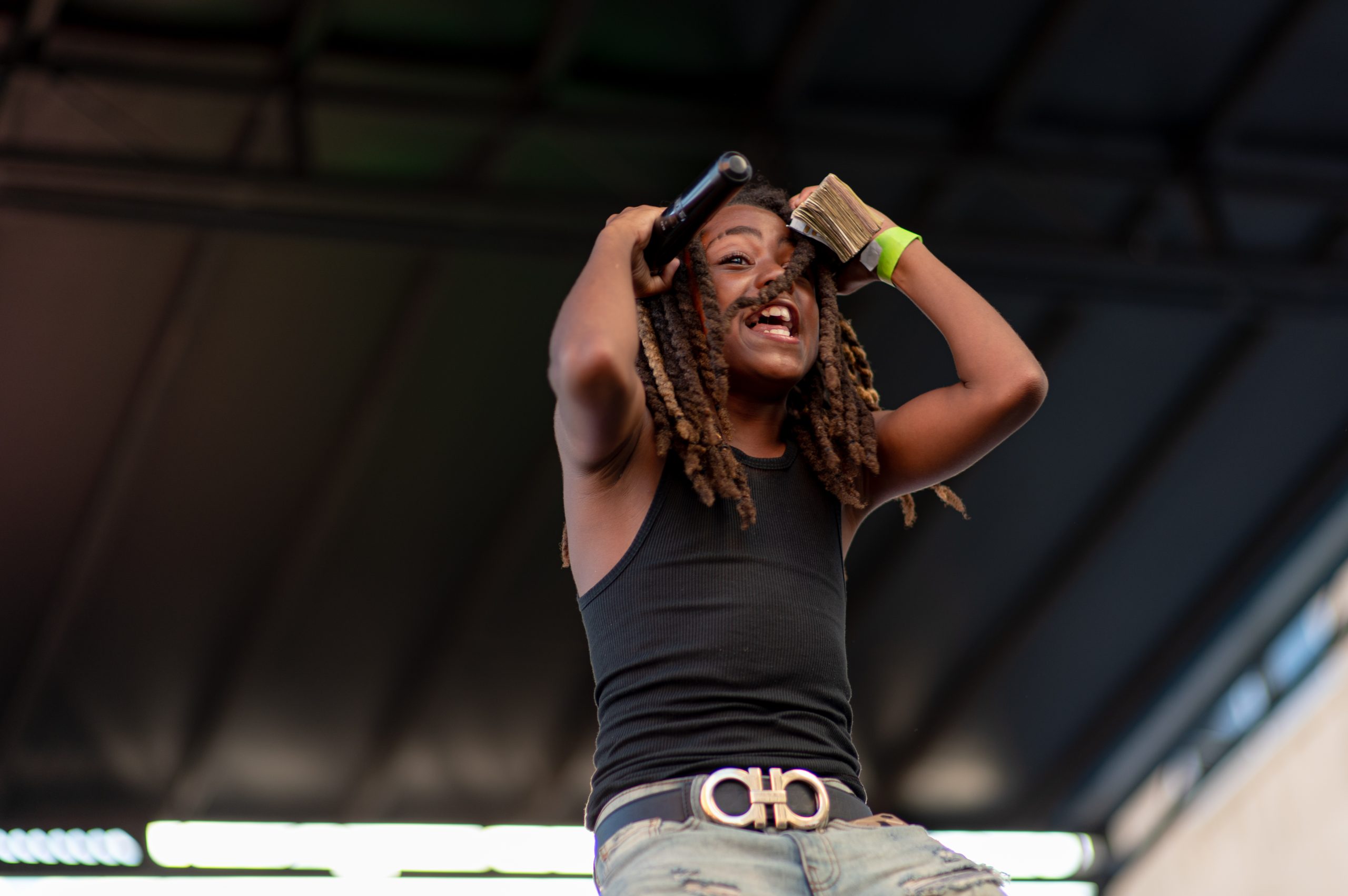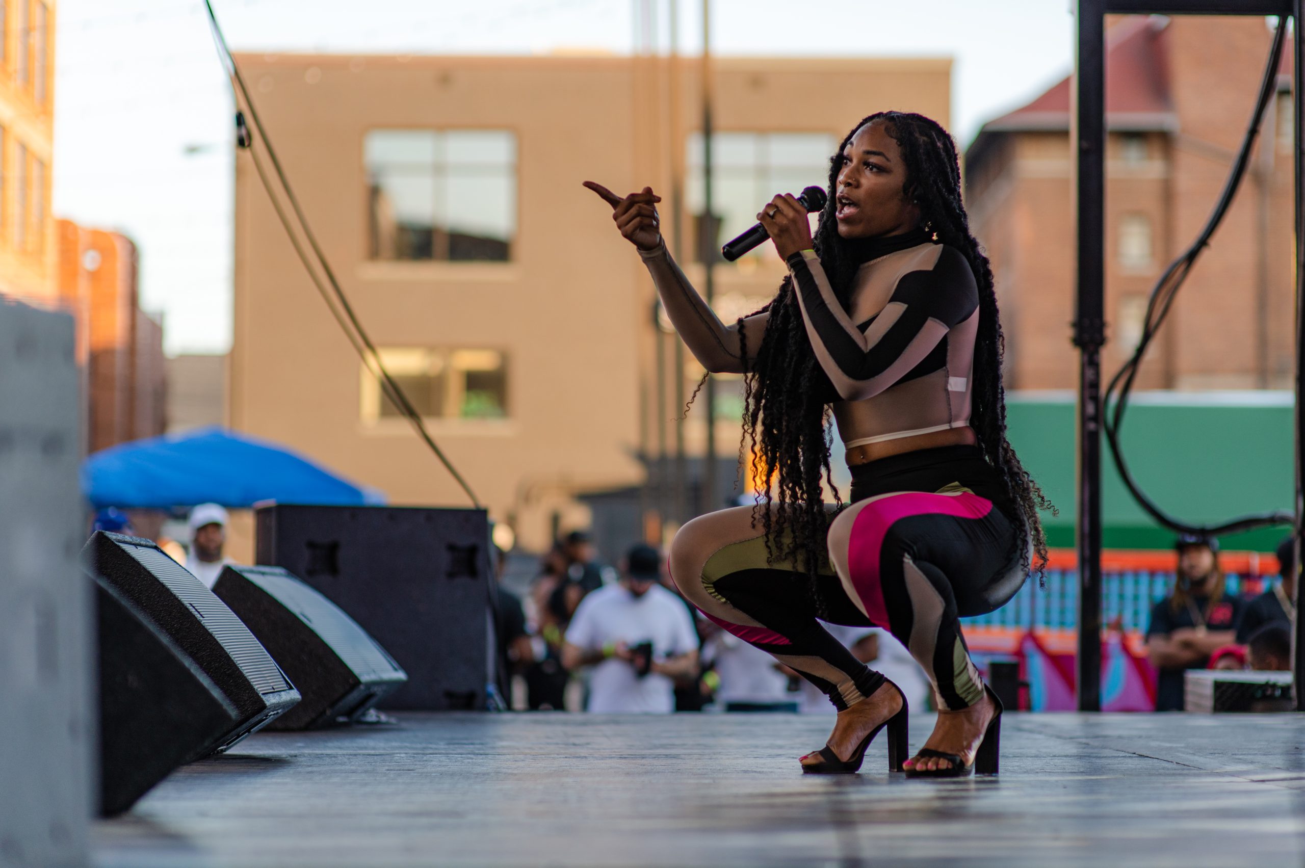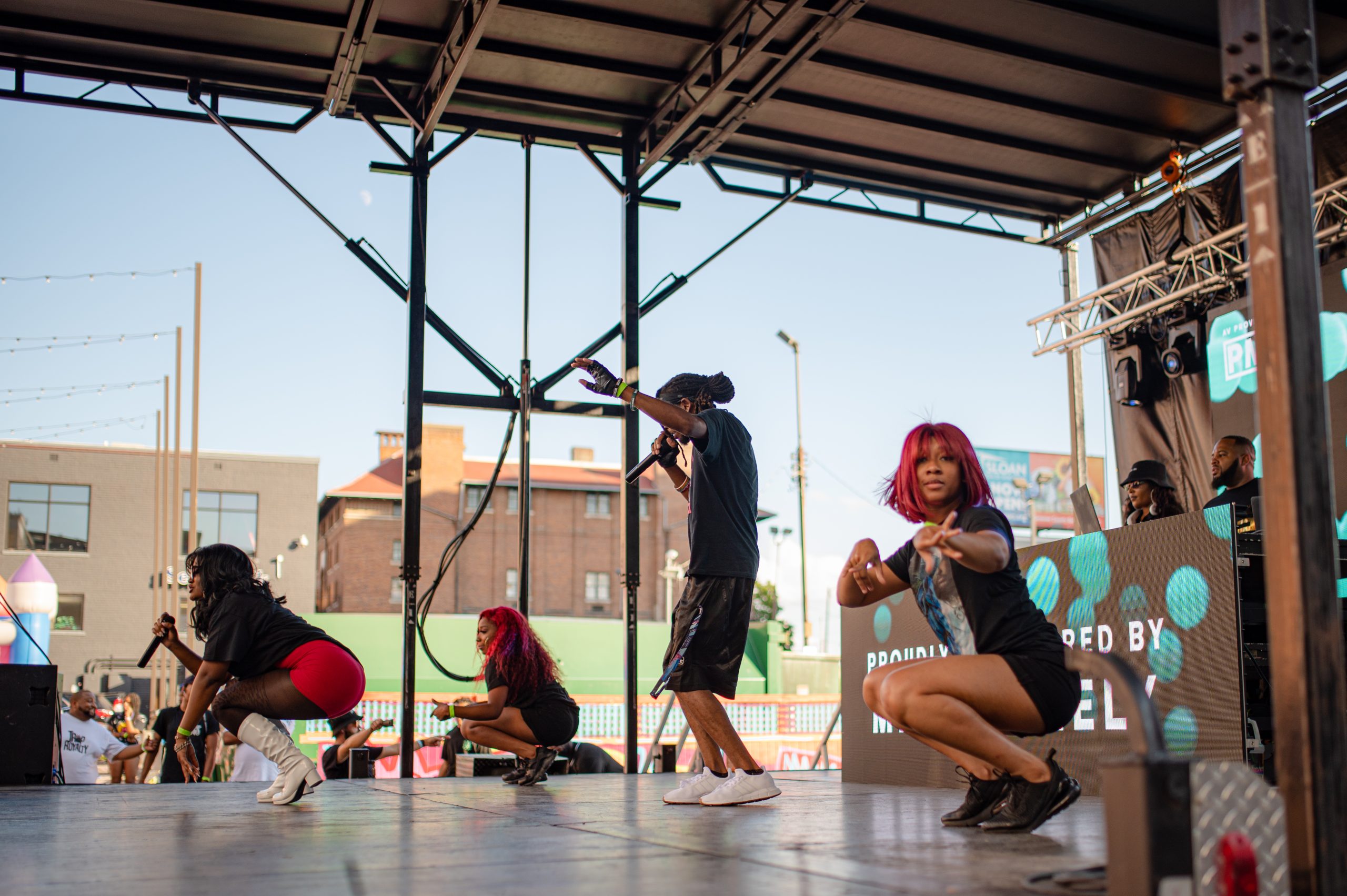Brieon Jones dances on stage while Flint-based rapper DFFrnt performs during Glizzy Fest in Downtown Flint, Mich. on August 6, 2022. (Michael Indriolo | Flint Beat)