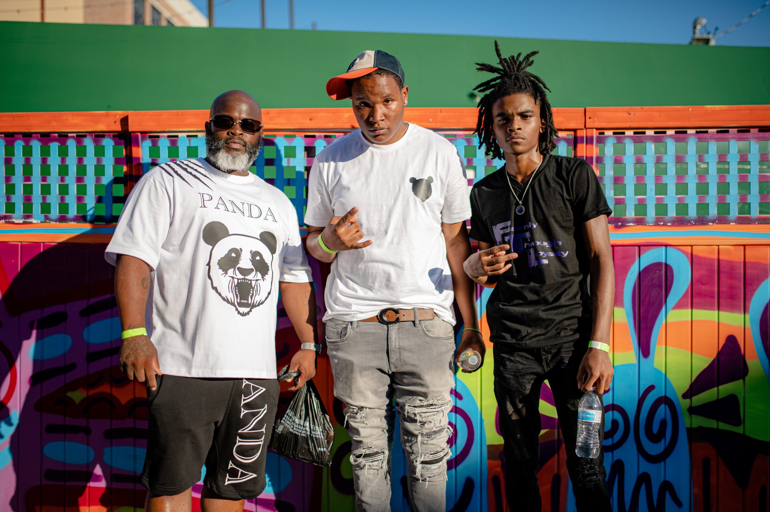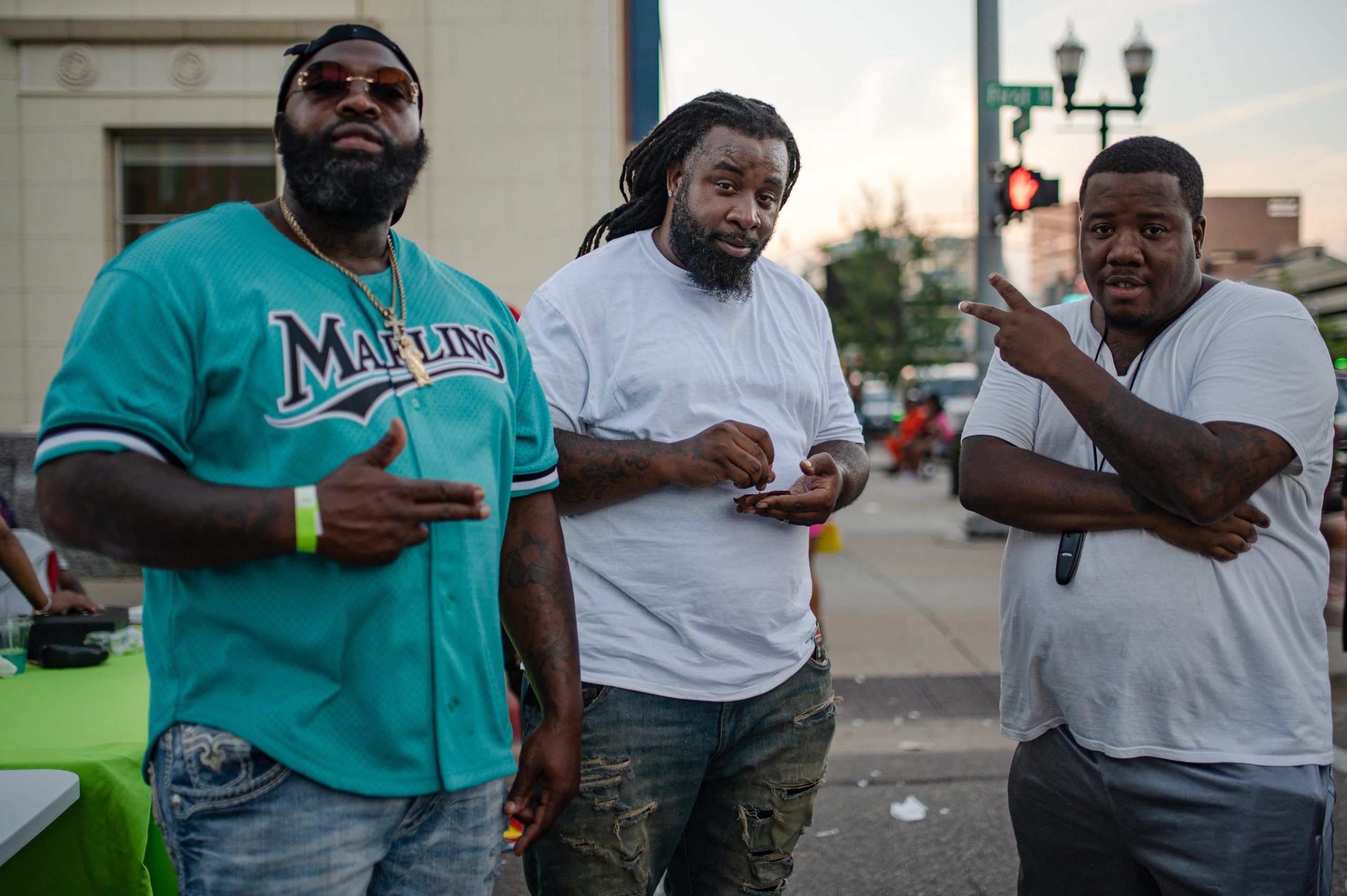 Flint-based rappers YBG Travo and FTL Quey pose for a portrait with Travis Fulmore, owner of Credit Masters LLC, during Glizzy Fest in Downtown Flint, Mich. on August 6, 2022. (Michael Indriolo | Flint Beat)