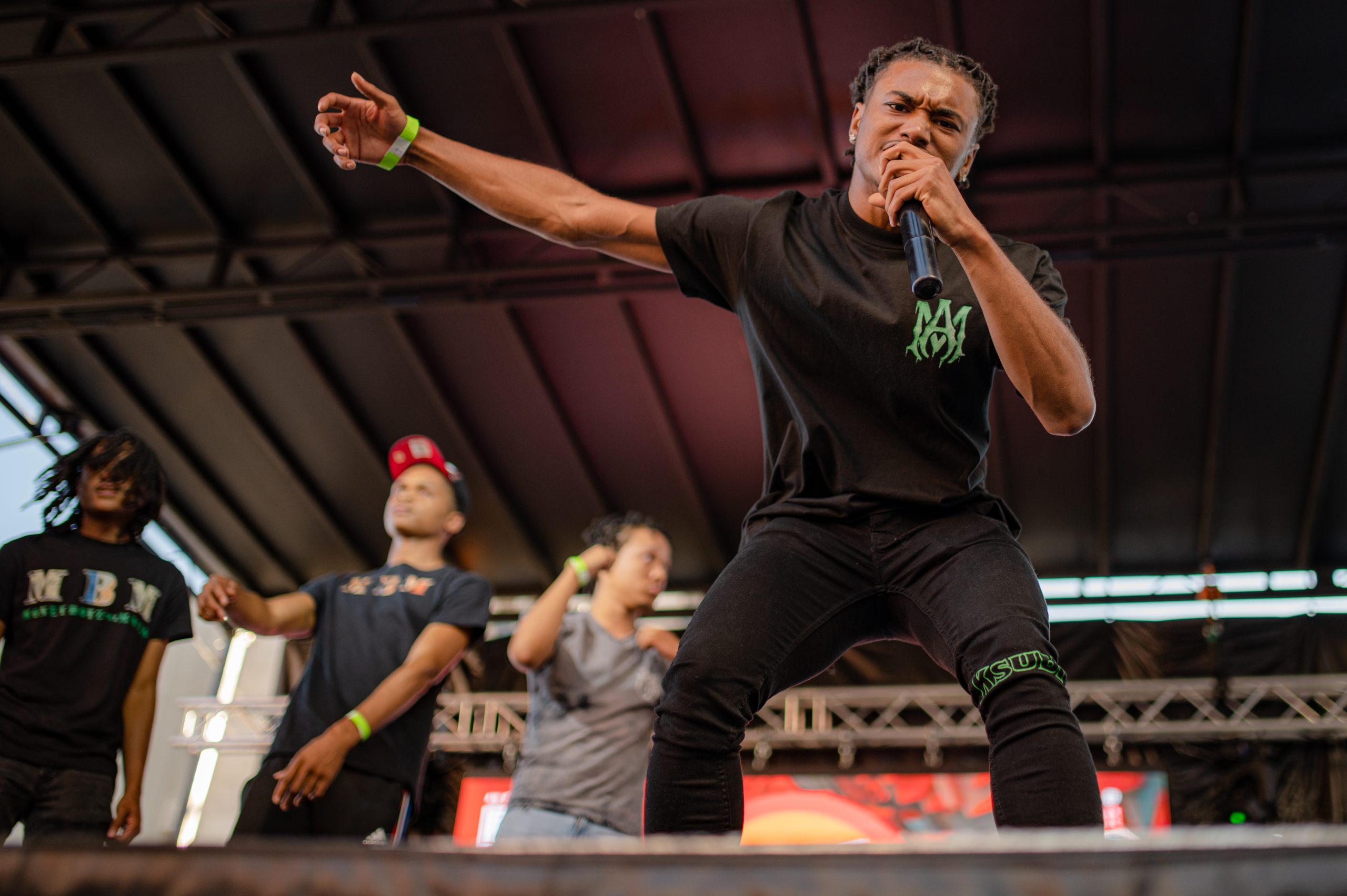 Flint-based rappers JernÄ, Cameron Tyler and Rockstar Bobby perform during Glizzy Fest in Downtown Flint, Mich. on August 6, 2022. (Michael Indriolo | Flint Beat)