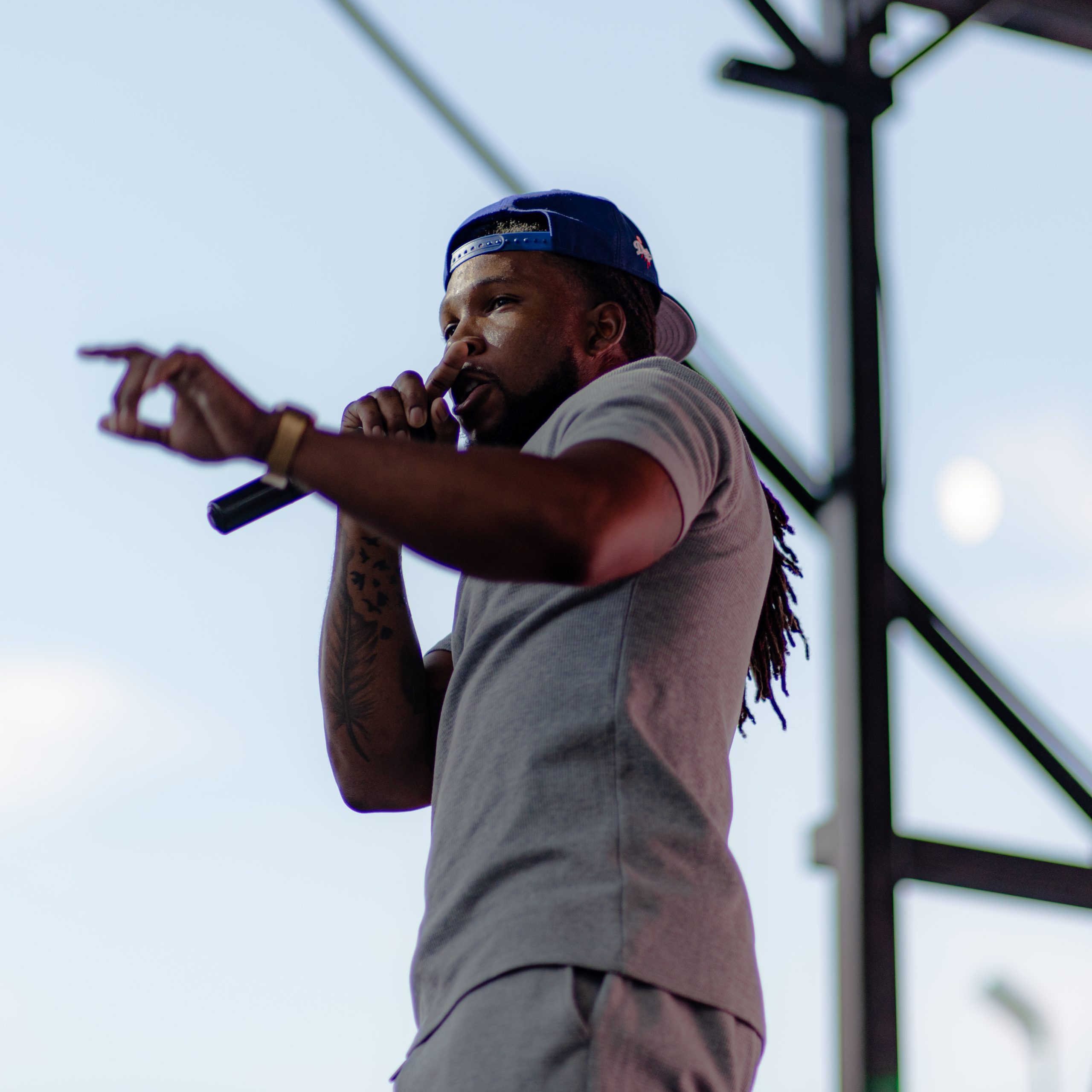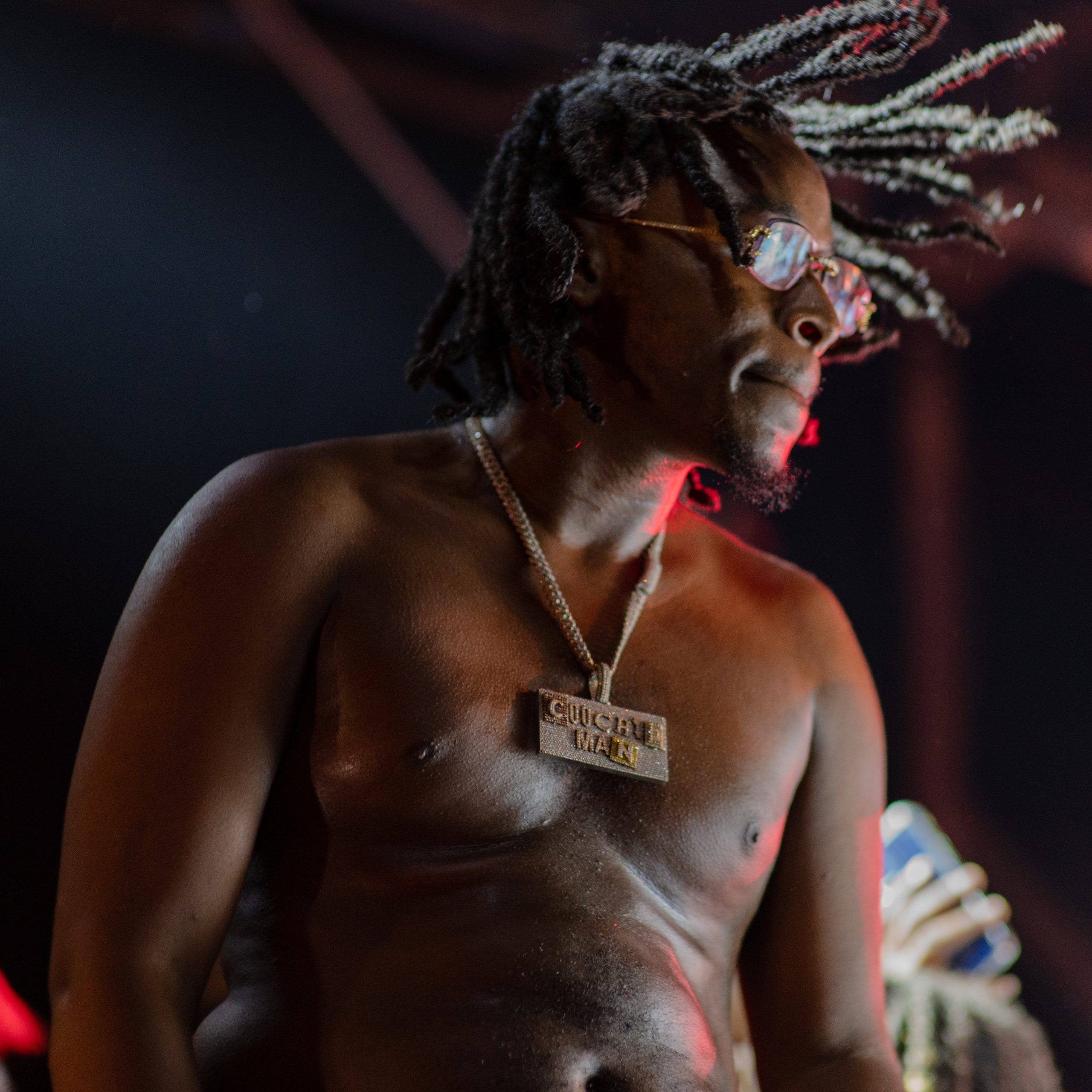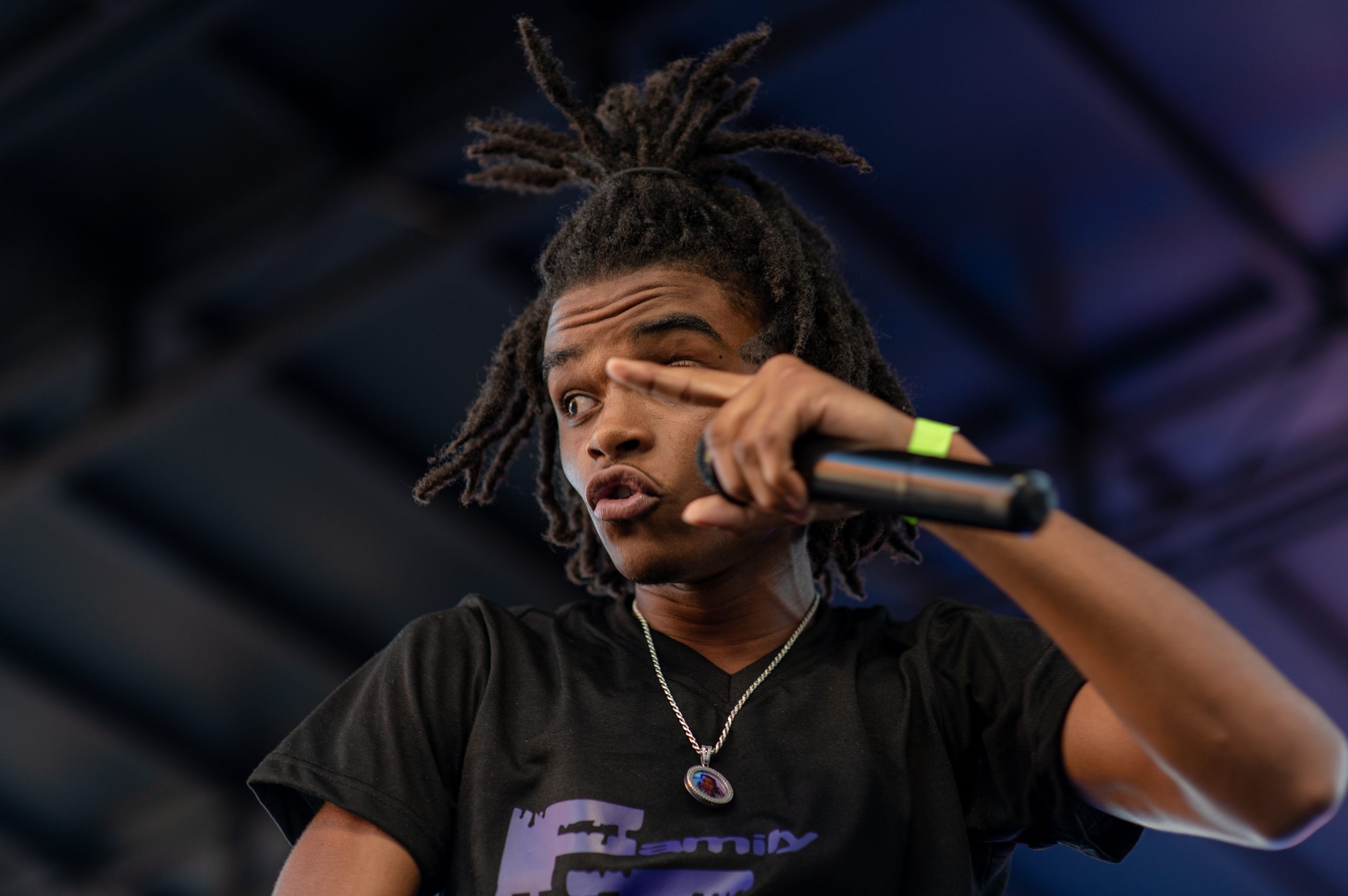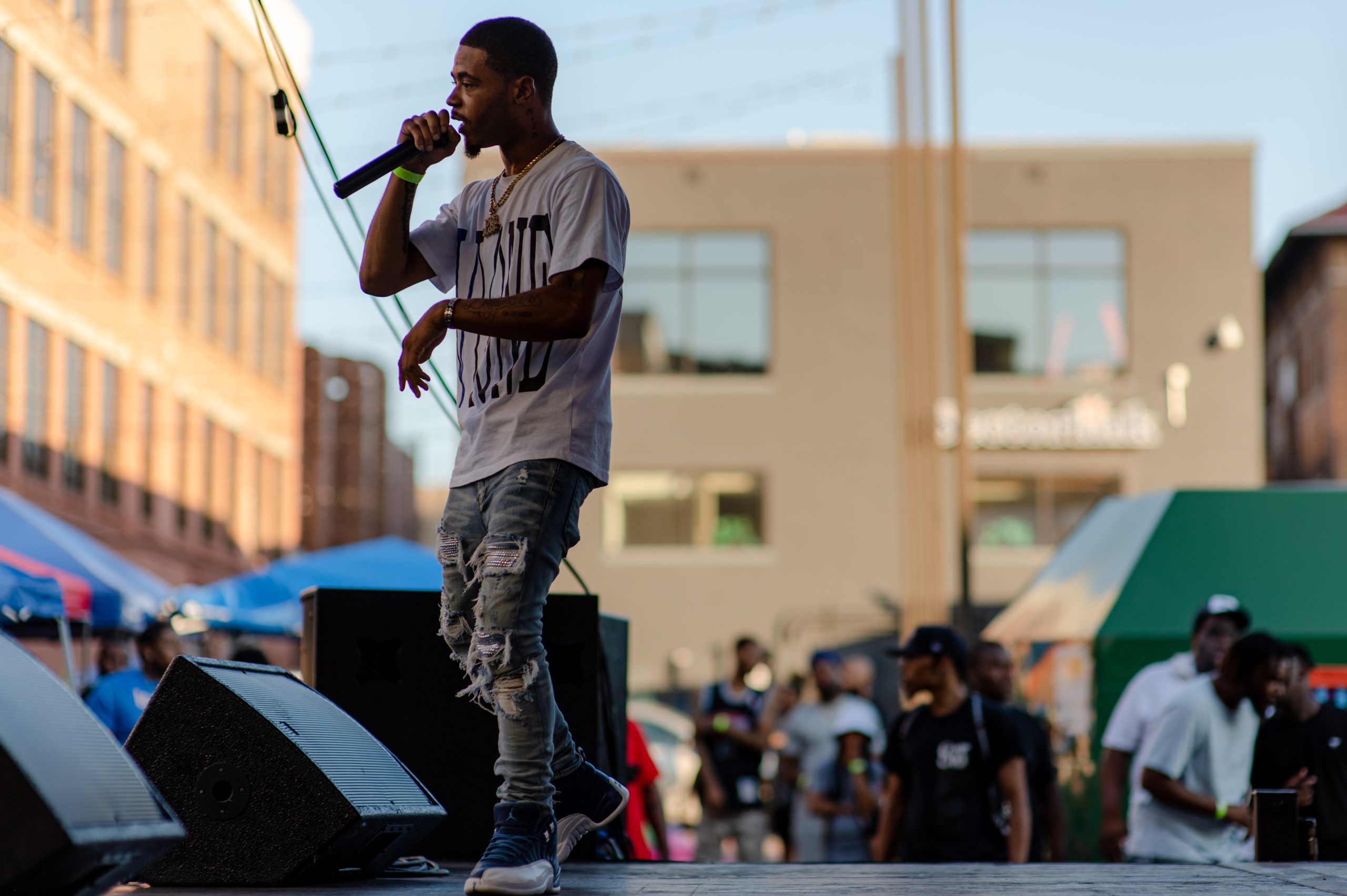 Flint-based rapper Jackman Raps walks toward the stage during Glizzy Fest in Downtown Flint, Mich. on August 6, 2022. (Michael Indriolo | Flint Beat)