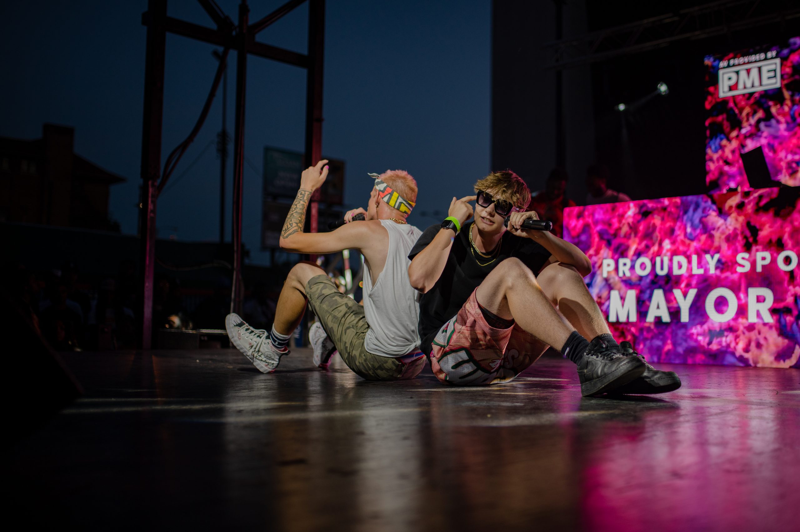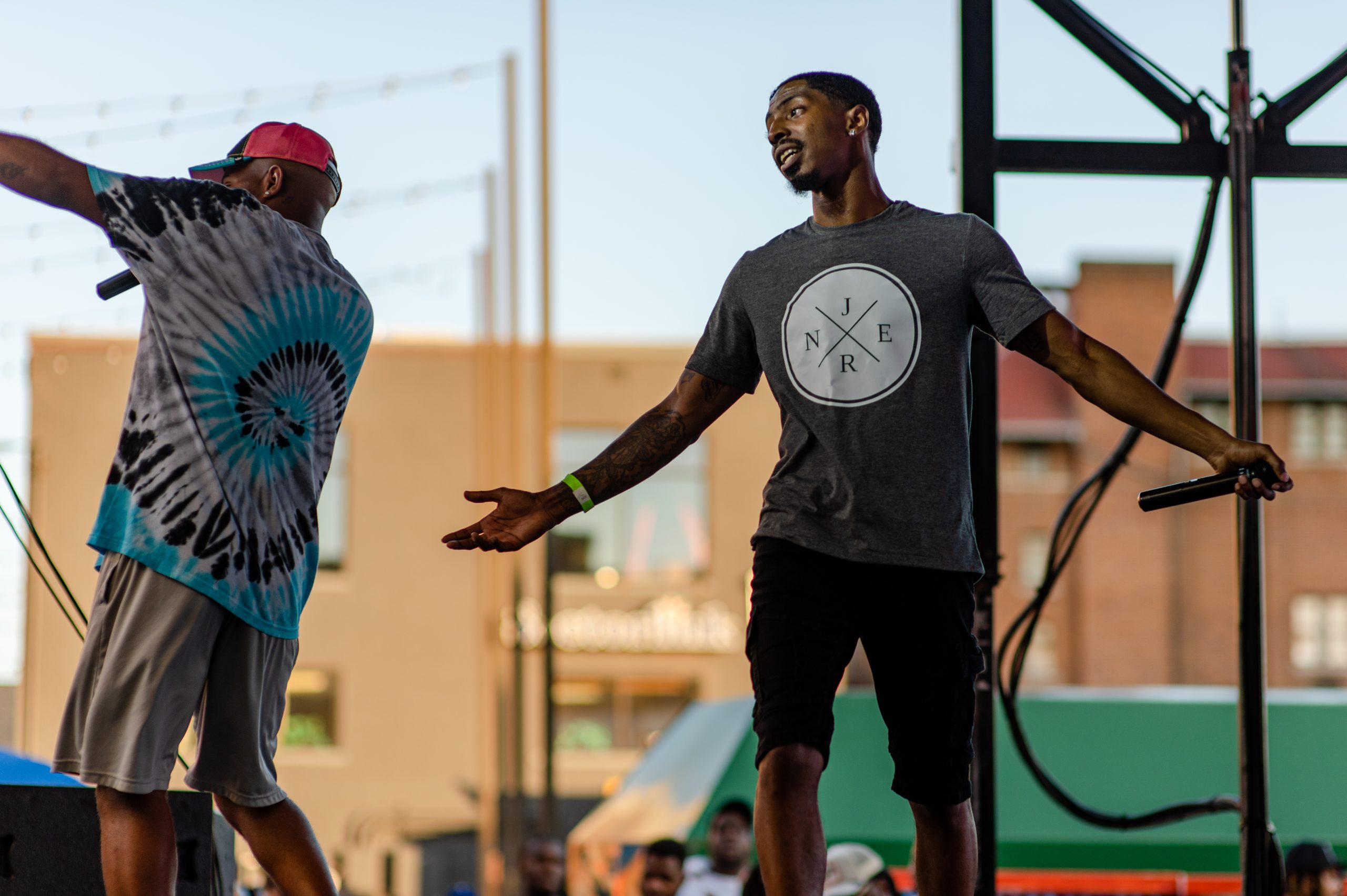 Flint-based rappers JernÄ and Sway Montoya perform during Glizzy Fest in Downtown Flint, Mich. on August 6, 2022. (Michael Indriolo | Flint Beat)