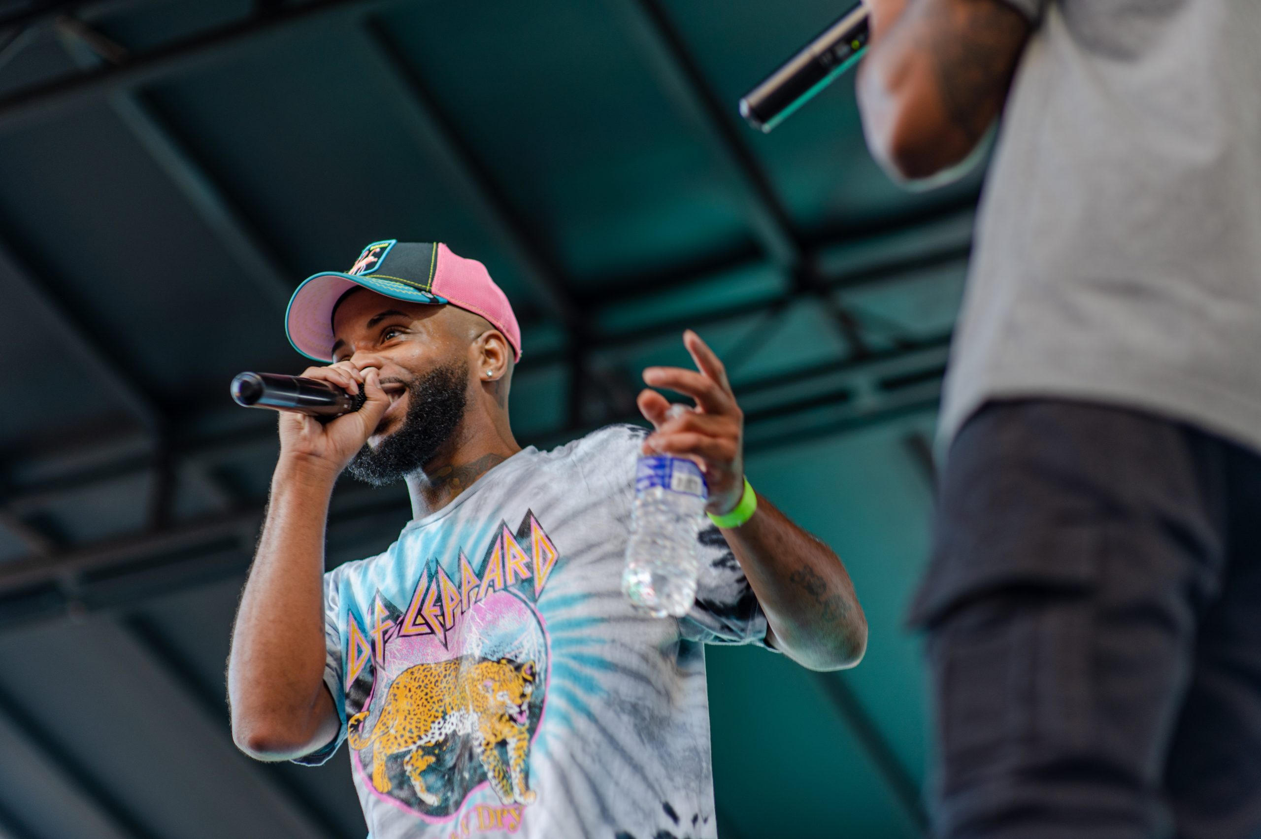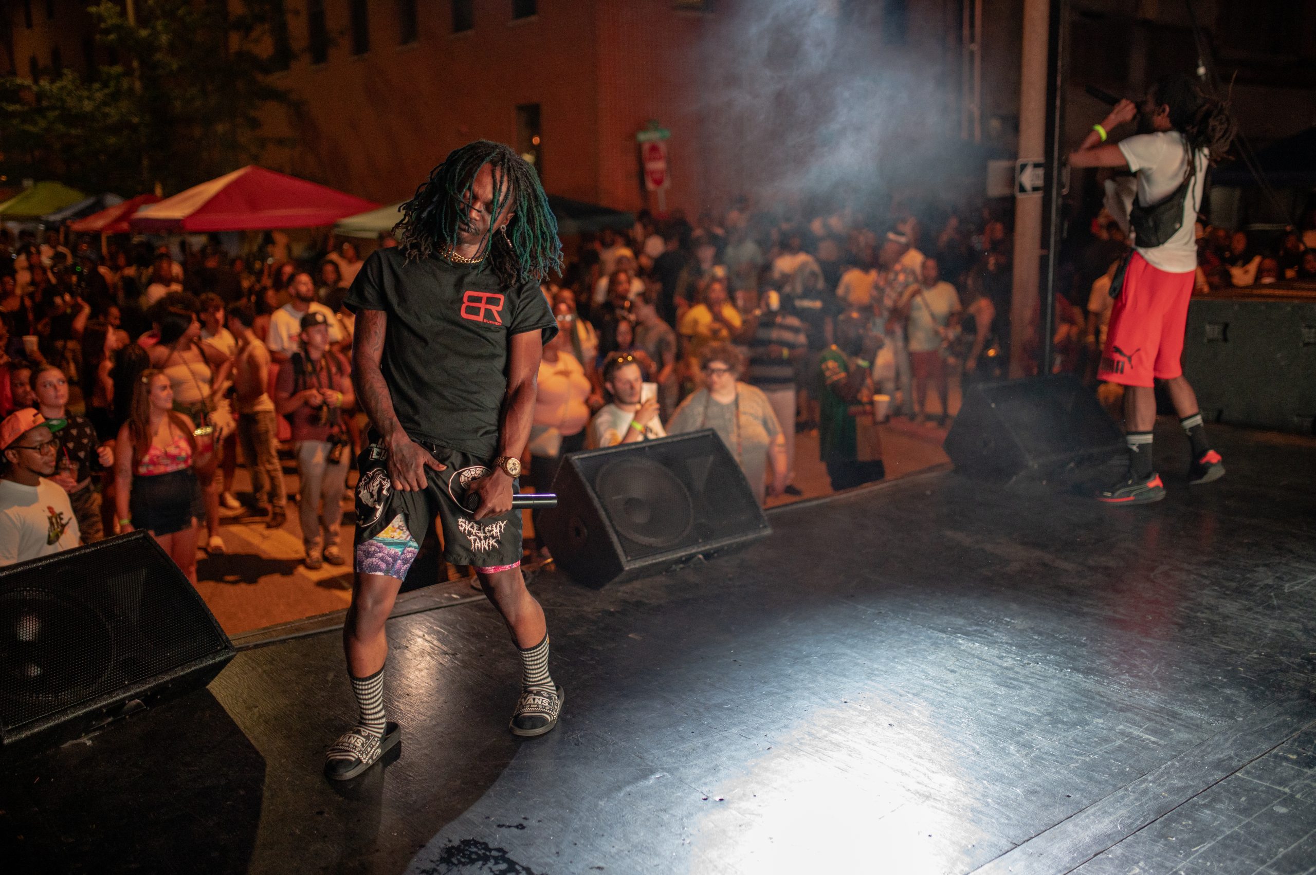 Flint-based rapper DFFrnt performs with Brieon Jones hyping him up during Glizzy Fest in Downtown Flint, Mich. on August 6, 2022. (Michael Indriolo | Flint Beat)
