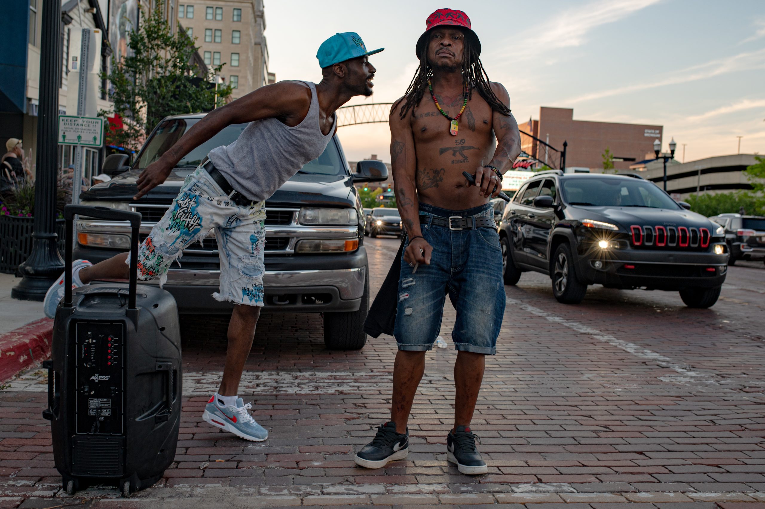Charles lee Ray and NGE Grell dance outside of Glizzy Fest in Downtown Flint, Mich. on August 6, 2022. (Michael Indriolo | Flint Beat)