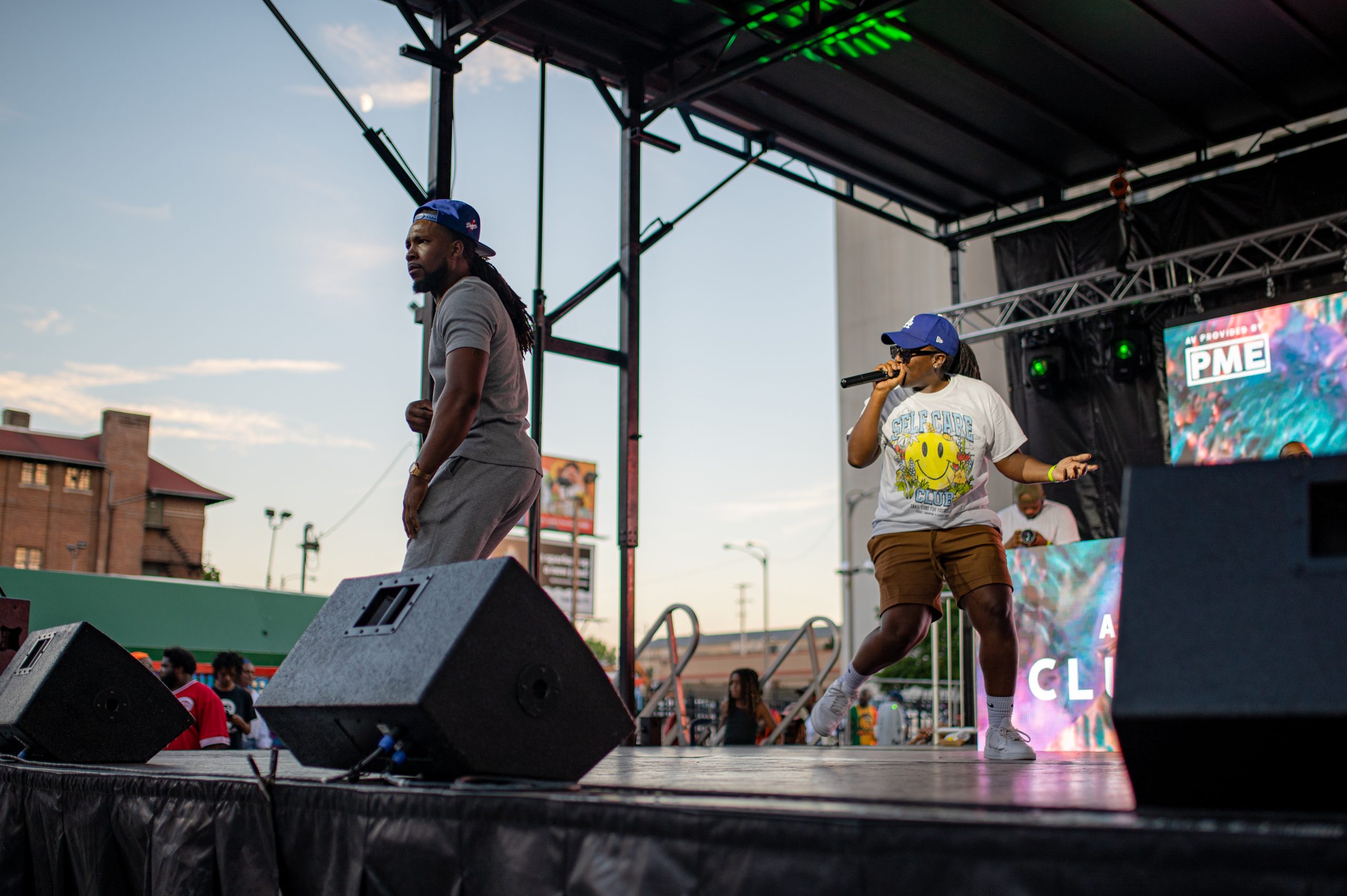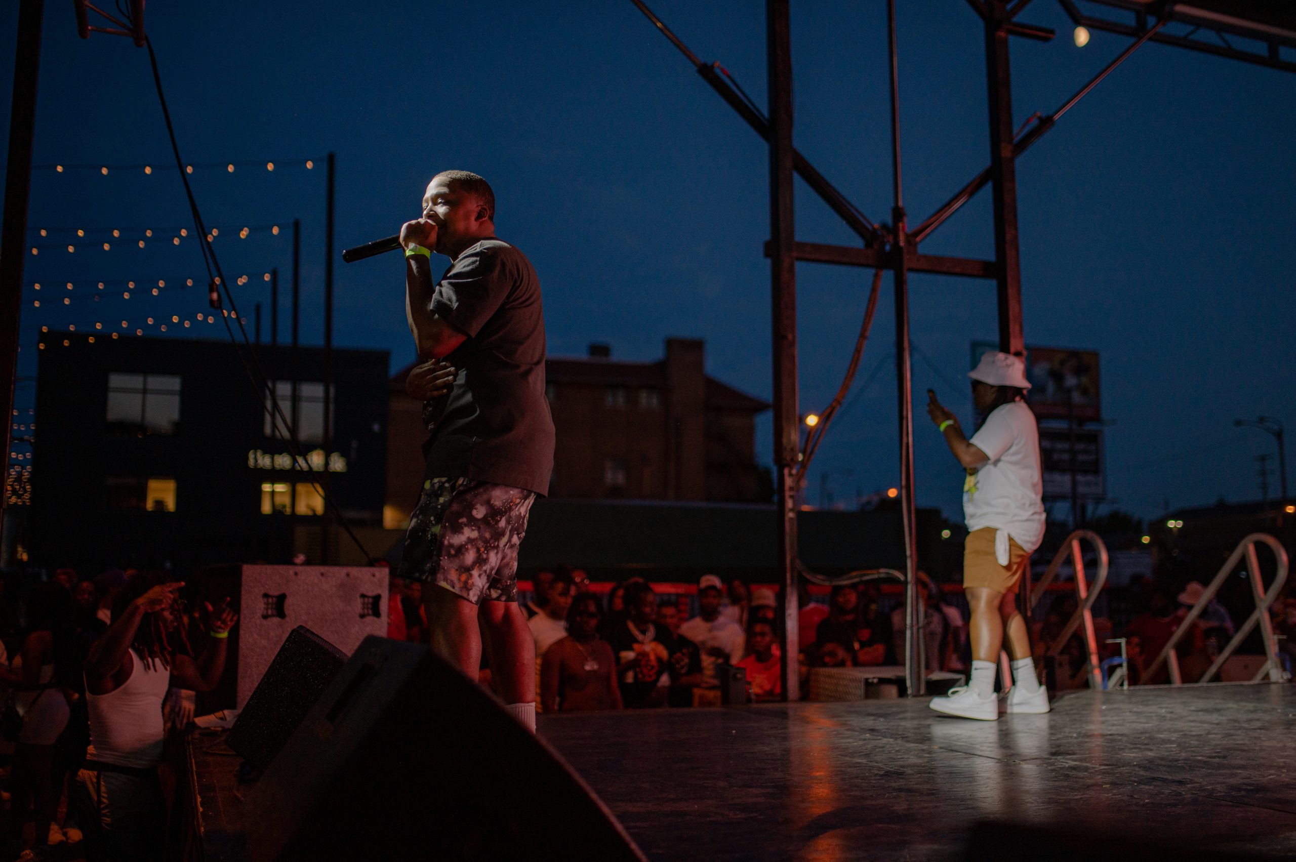 Flint-based rappers Sway Montoya and JernÄ perform during Glizzy Fest in Downtown Flint, Mich. on August 6, 2022. (Michael Indriolo | Flint Beat)