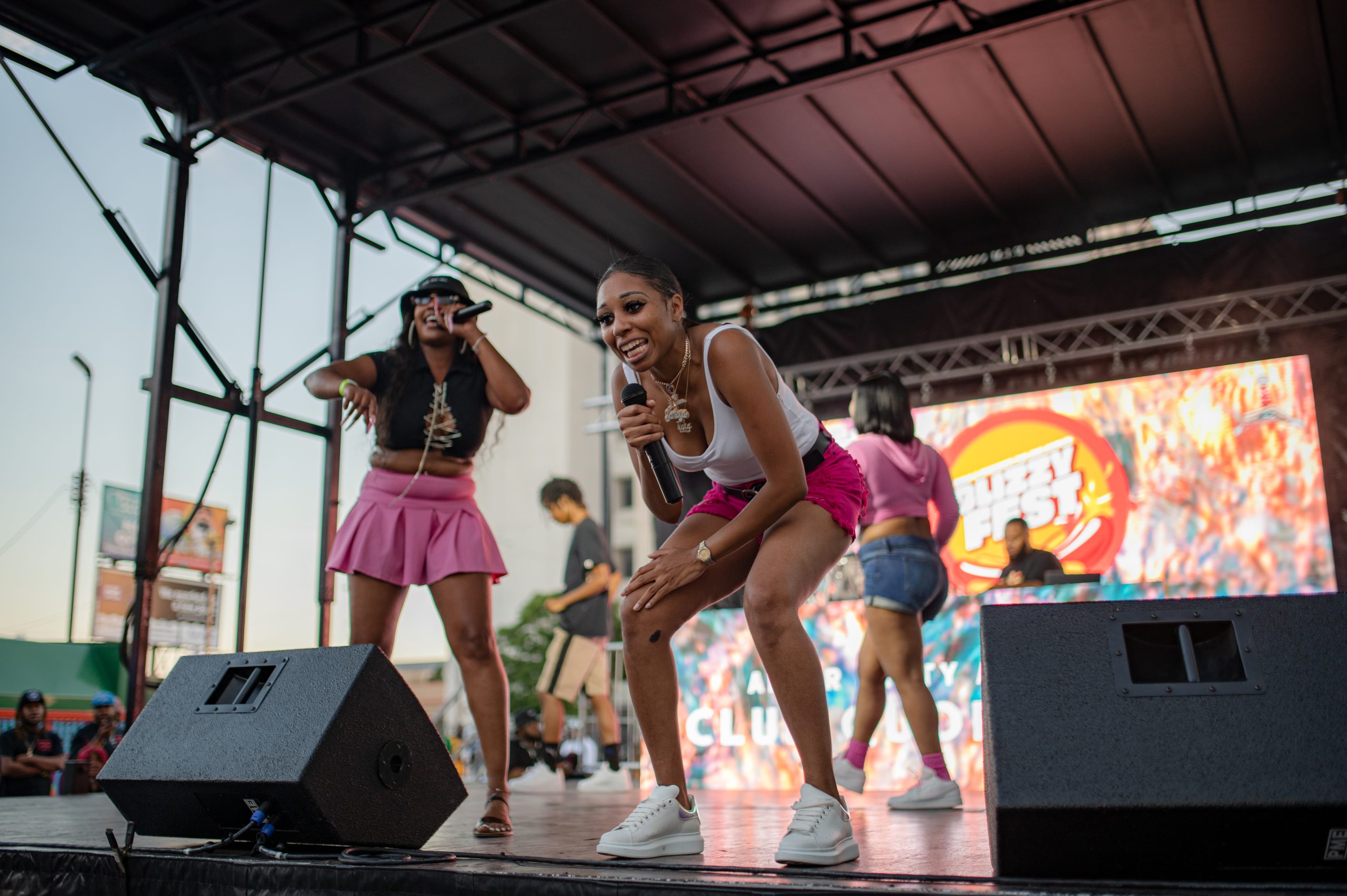 Flint-based rappers Tiera Santoya and Paradise perform during Glizzy Fest in Downtown Flint, Mich. on August 6, 2022. (Michael Indriolo | Flint Beat)