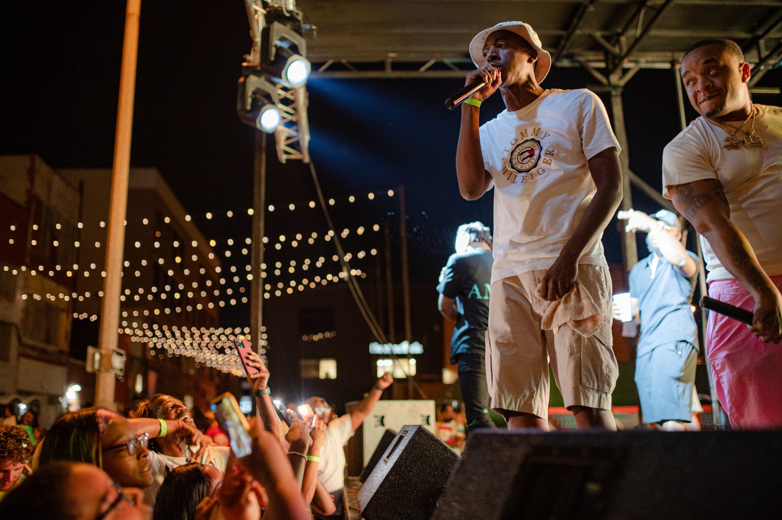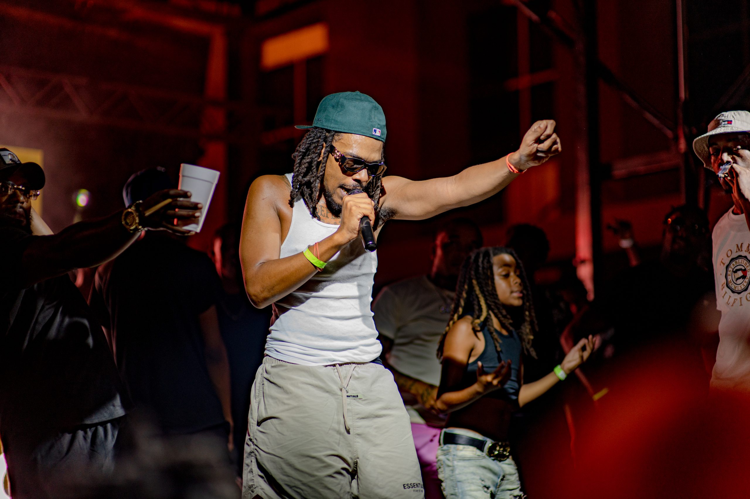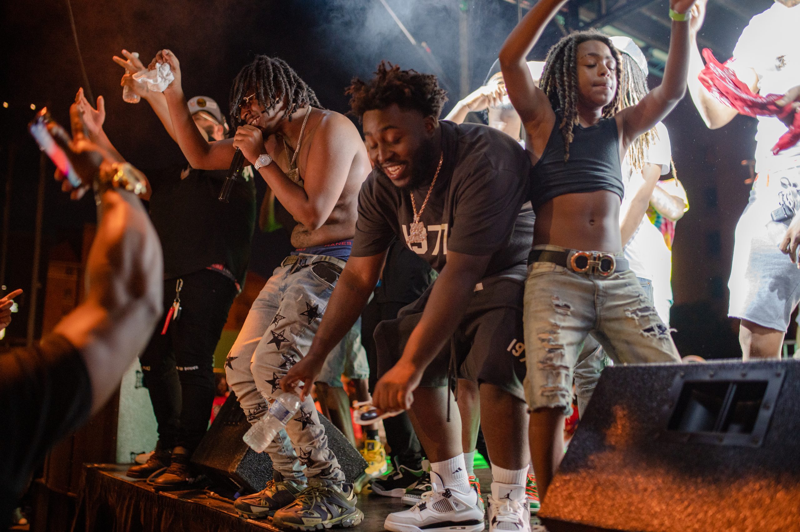 Flint-based rapper Detwan Love performs while others dance on stage with him during Glizzy Fest in Downtown Flint, Mich. on August 6, 2022. (Michael Indriolo