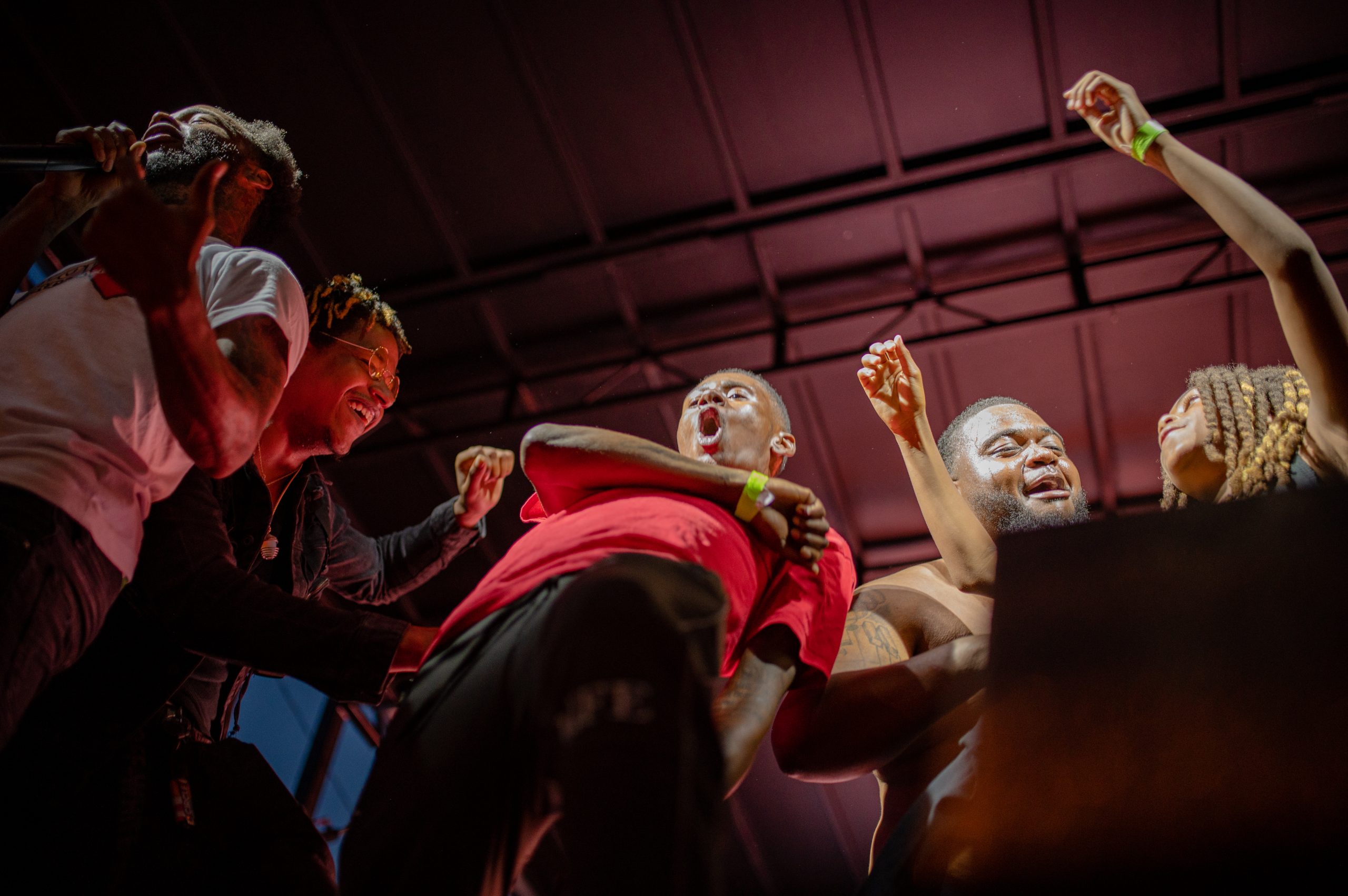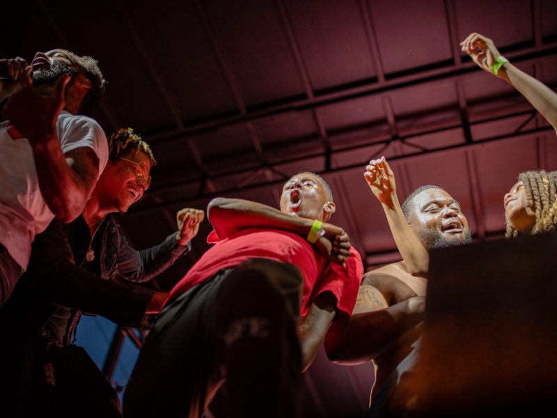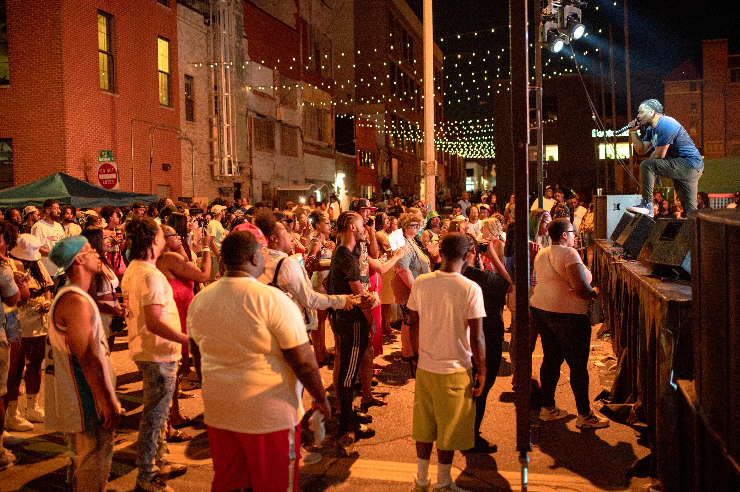 Flint-based rapper Detwan Love performs while others dance on stage with him during Glizzy Fest in Downtown Flint, Mich. on August 6, 2022. (Michael Indriolo
