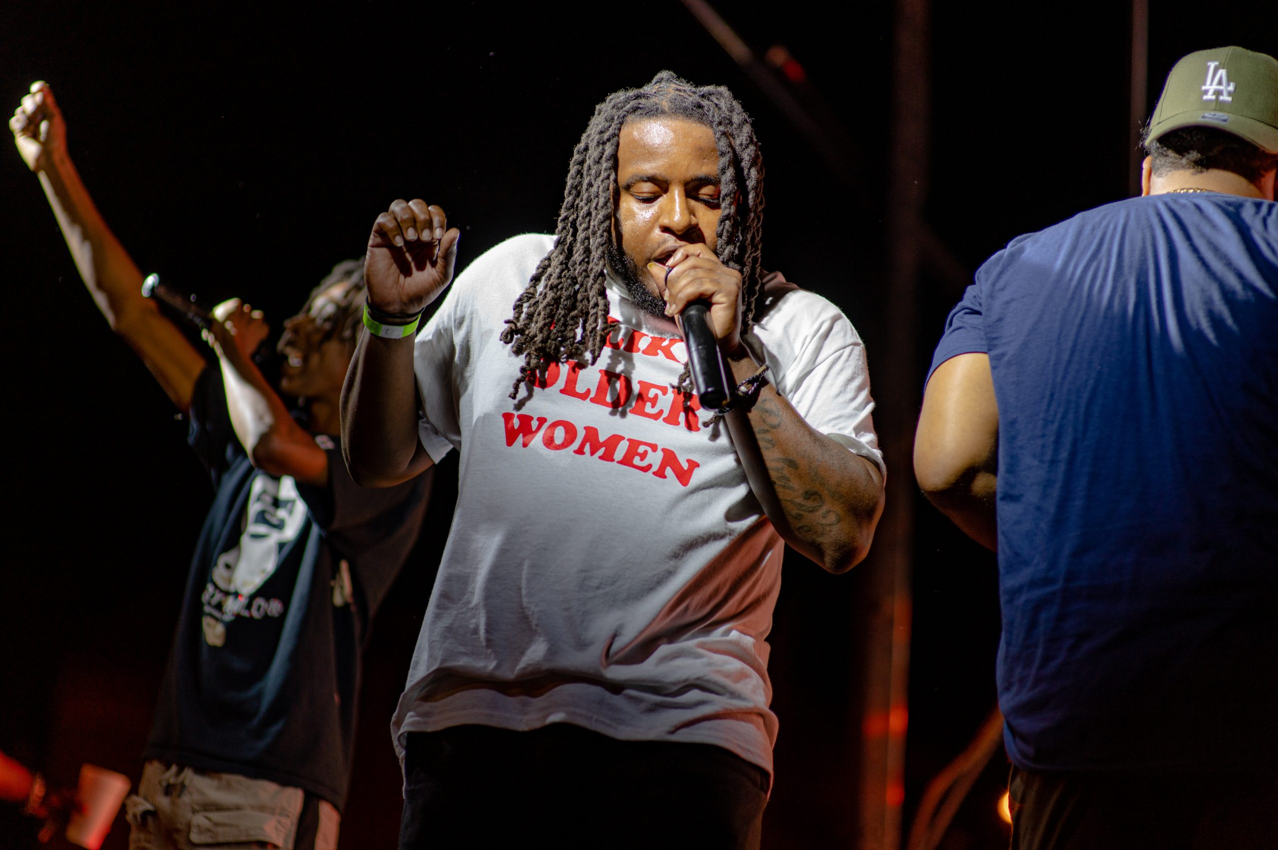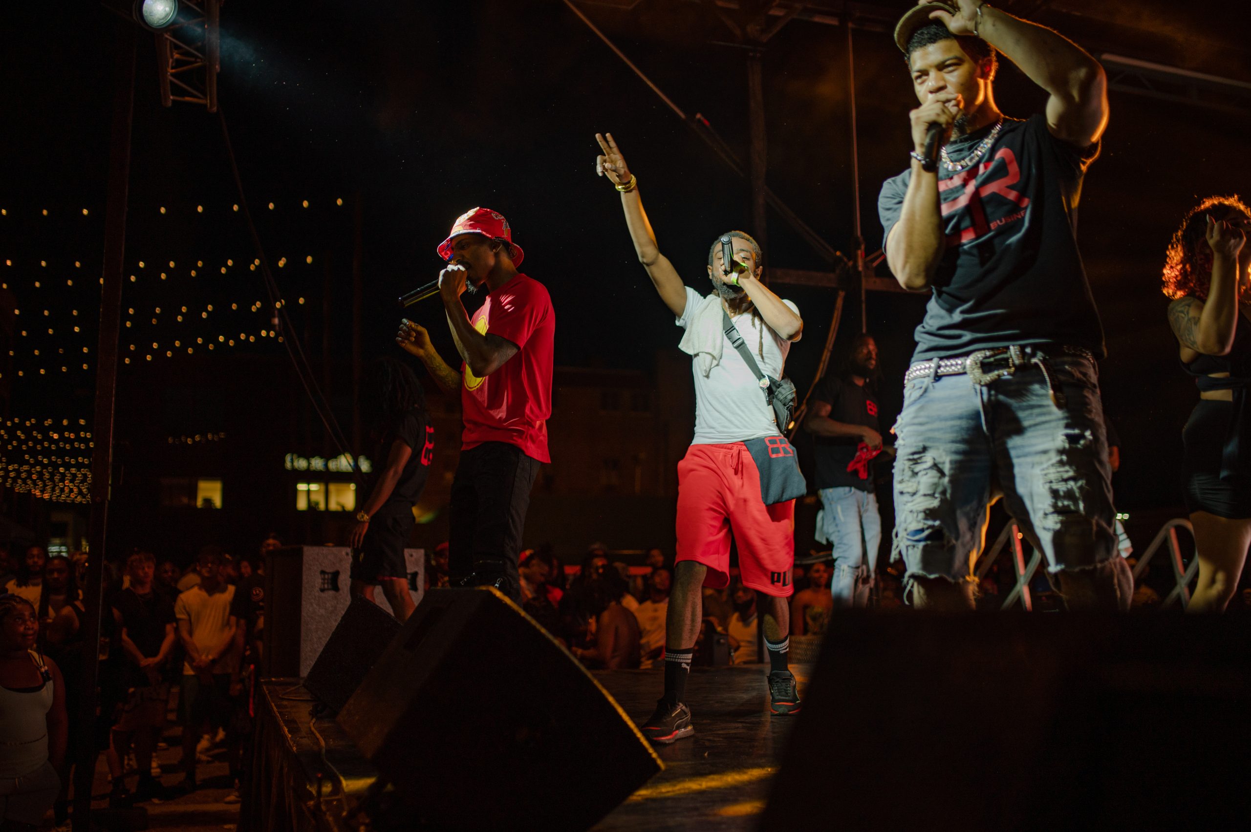 Flint-based rappers Jeff Skigh, Twicee and Velly Beretta perform during Glizzy Fest in Downtown Flint, Mich. on August 6, 2022. (Michael Indriolo | Flint Beat)