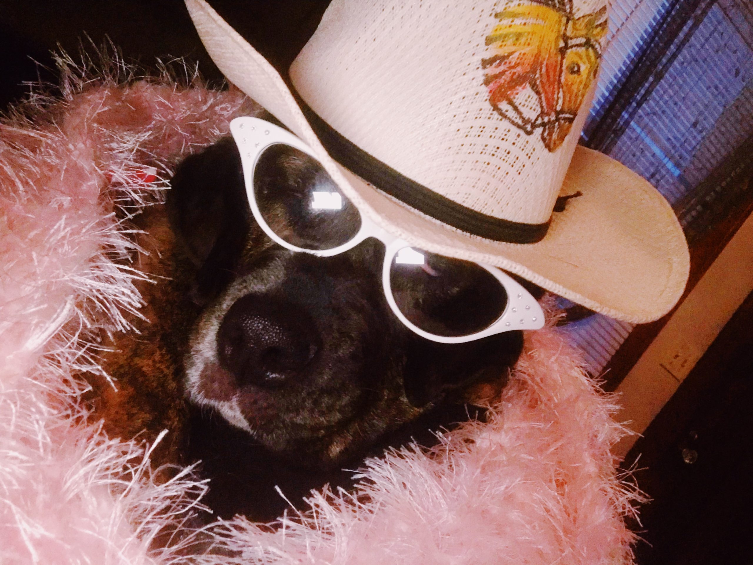 Flint Beat photojournalist KT Kanazawich dresses up her dog, Sheryl, to party at home. (KT Kanazawich | Flint Beat)