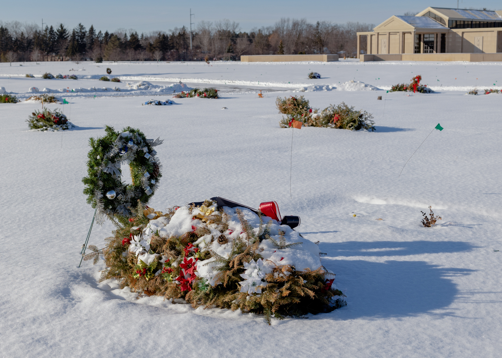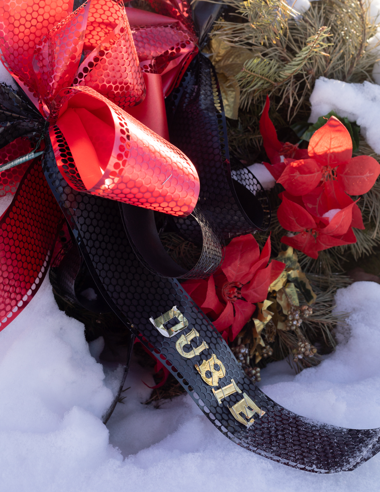 That’s when his family made him a grave blanket, a bundle of evergreen branches and a large bow made of red and black ribbon. Its tail reads “DUBIE,” Elvin’s nickname, in gold letters that now gleam in the cold, February sunlight.