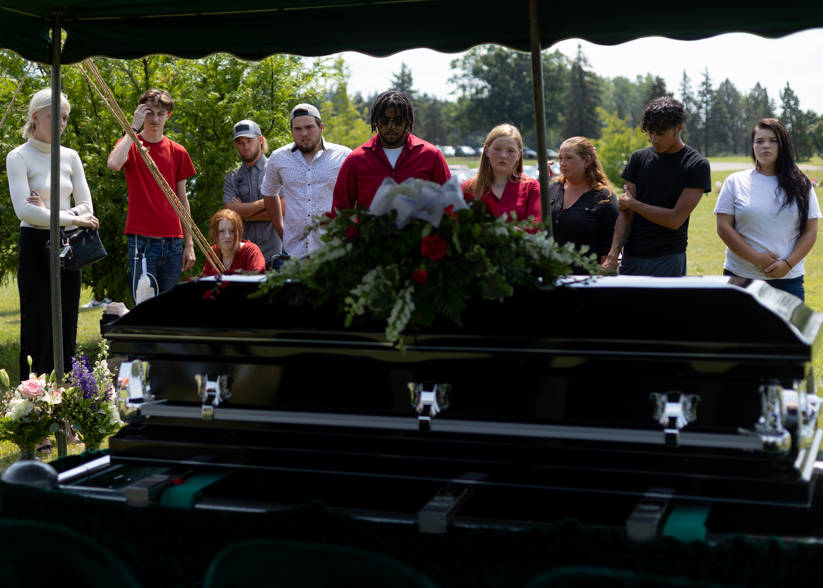 Elvin’s friends lingered after his family’s departure, each putting a hand atop the casket’s shiny black lid as if to include its occupant in their conversation. Though it was hot under the tent now, no one seemed to mind sweating as they cried and laughed, sharing stories about Elvin for another 20 minutes before falling silent.
