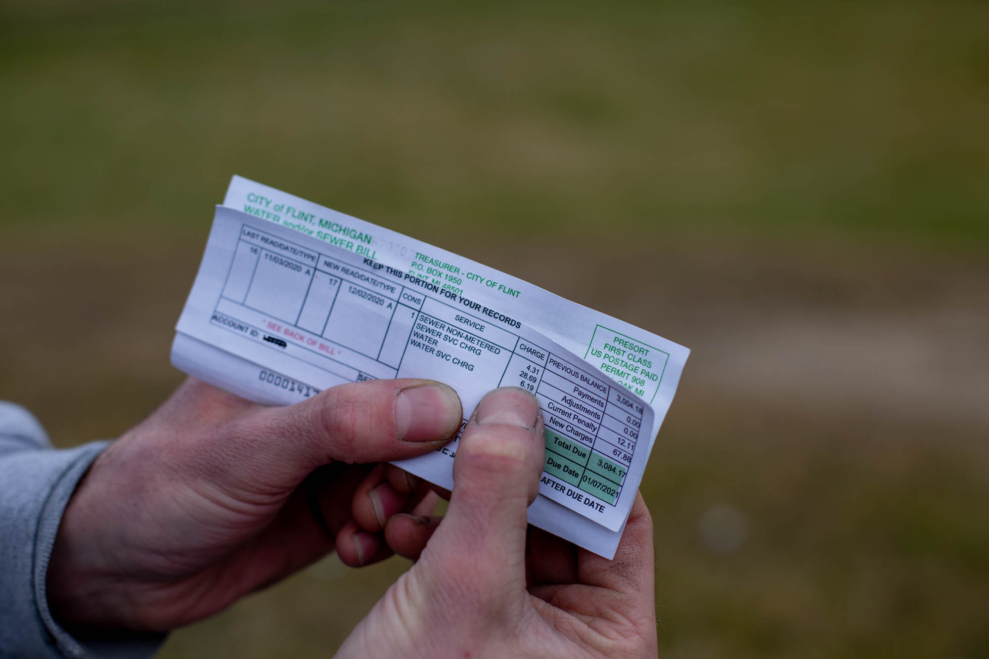 A Flint resident holds up a water bill from 2020. (KT Kanazawich | Flint Beat)