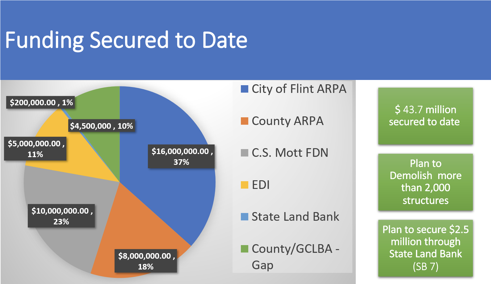 Freeman said the added properties mean the land bank will have to raise more money in order to complete all of the demolition needed in and around Flint, as its $45.3 million goal covered the initial number of properties anticipated, not the hundreds more now realized.
