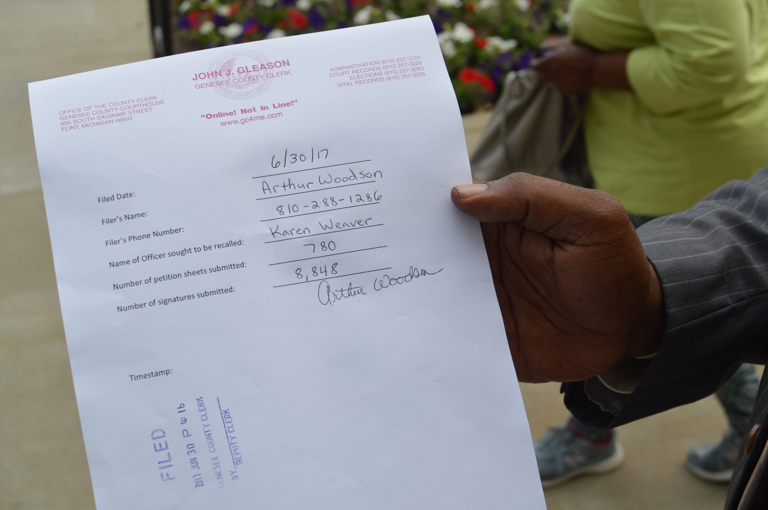 Flint resident, Arthur Woodson, submitted 780 petition sheets to the County Clerk. Woodson who is seeking to recall Weaver over the city’s controversial trash contract, turned in the signatures after canvassing neighborhoods for nearly 60 days.