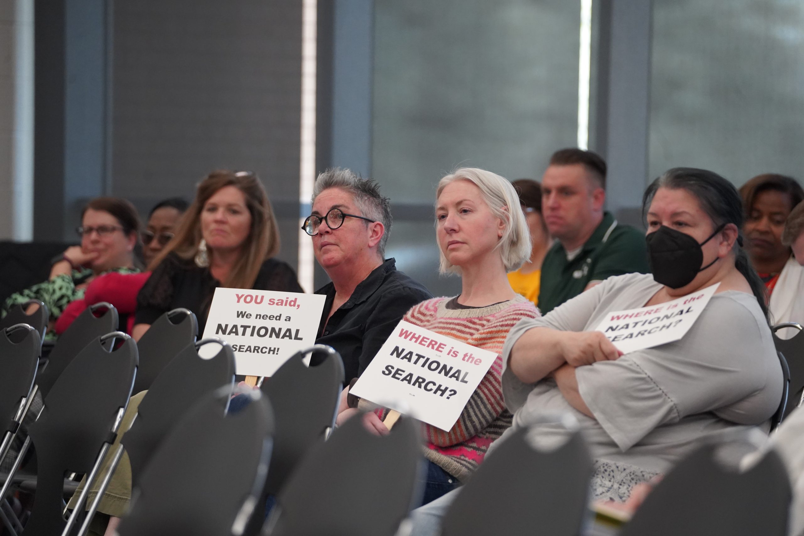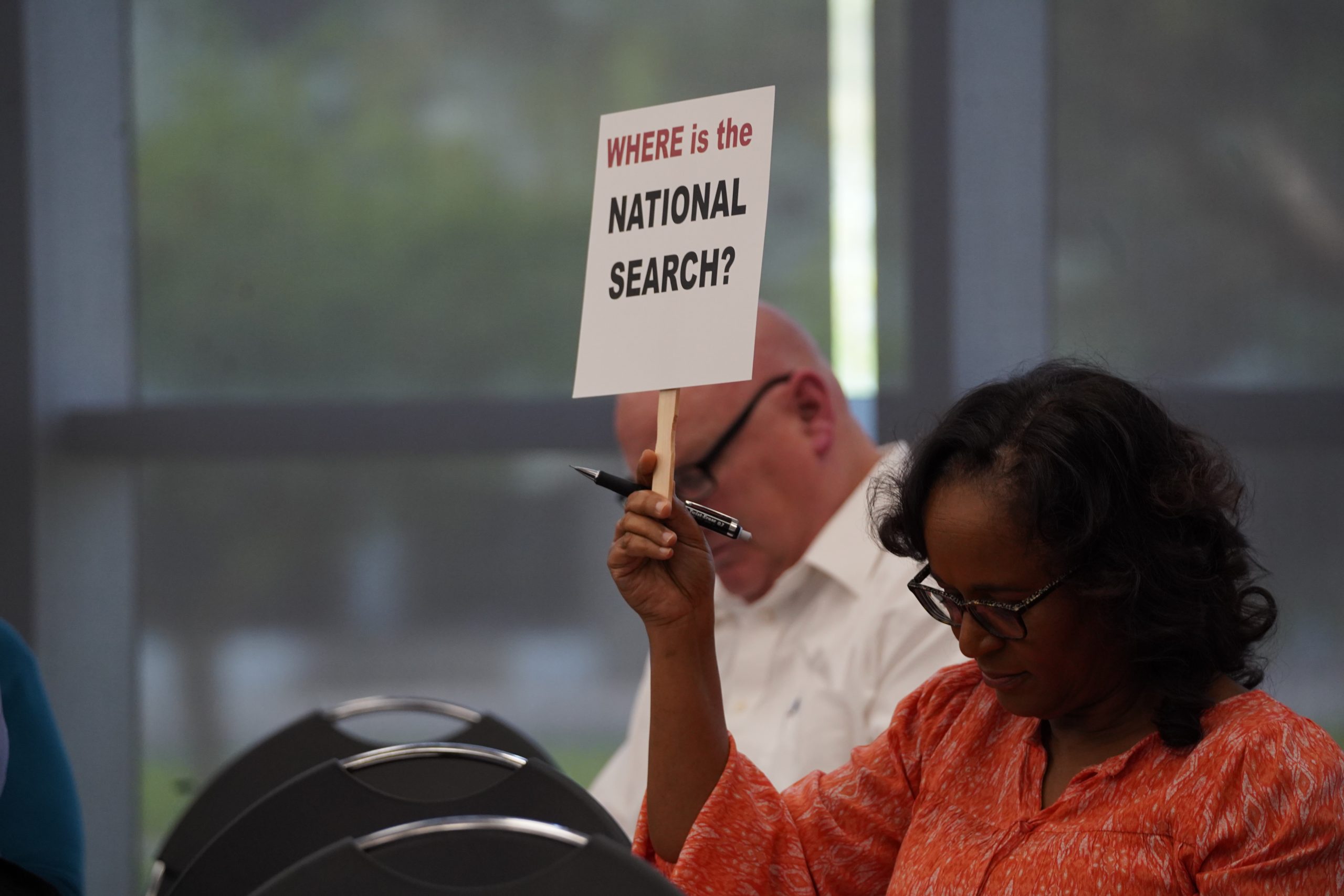 Outside the meeting, demonstrators gathered to echo the faculty union’s demand for a national search—an approach previously supported by Richardson-Snell herself.
