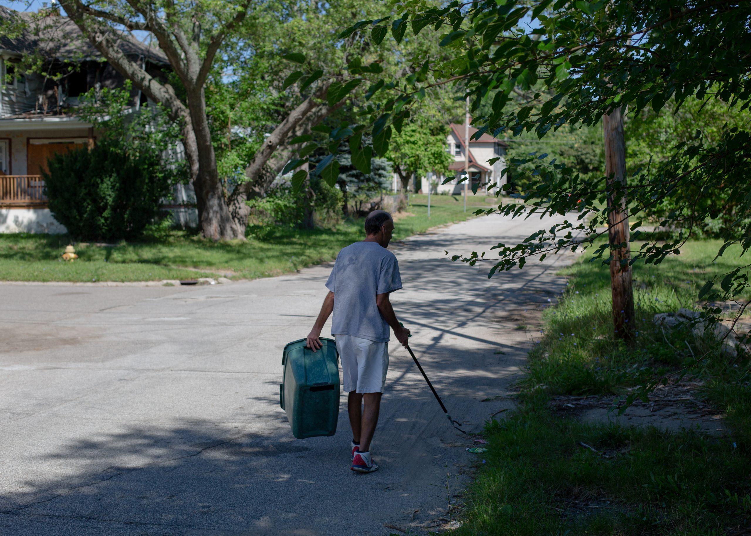 Hours later, his guests gone, Bob is walking down Cronk Avenue holding a red rubber-maid plastic container filled with garbage.