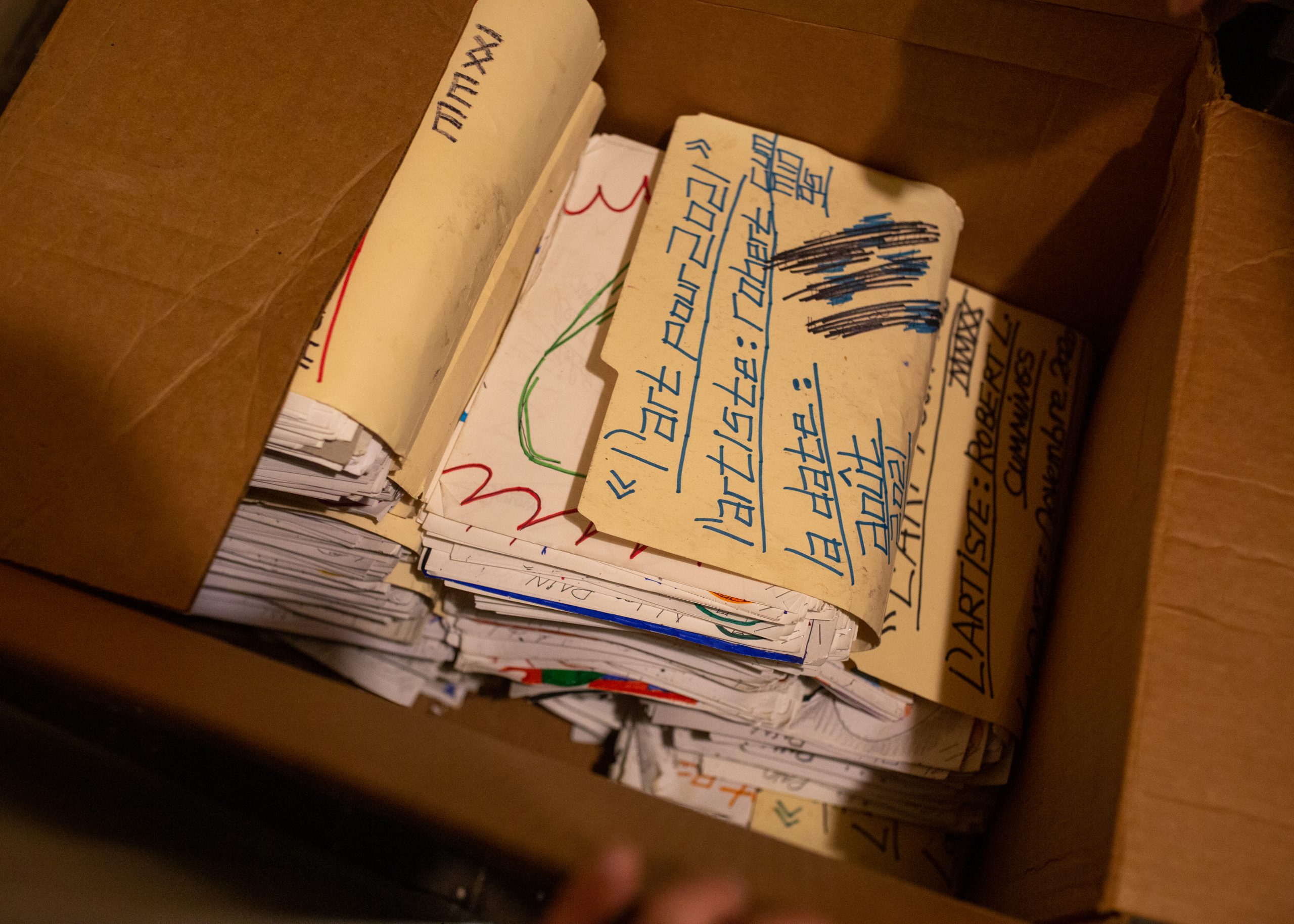 “I found all these folders that someone was trashing behind Angelo’s Coney Island. About a year or so ago they were throwing away a whole bunch of these. You know, I’m constantly drawing stuff up every day of the week. Some of these boxes are filled with papers that I just drew on the back of. The papers had order forms, employee reviews, bills, and complaints about coworkers.