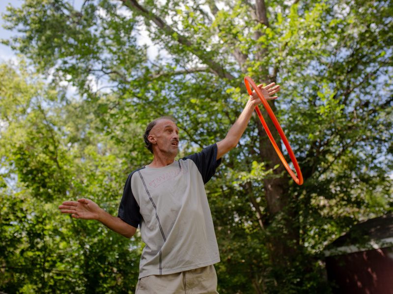 With an orange hula hoop in hand, Bob makes his way down the rickety wooden stairs that lead from his apartment and into the street. Grinning widely, he walks out onto the lawn beside his building.