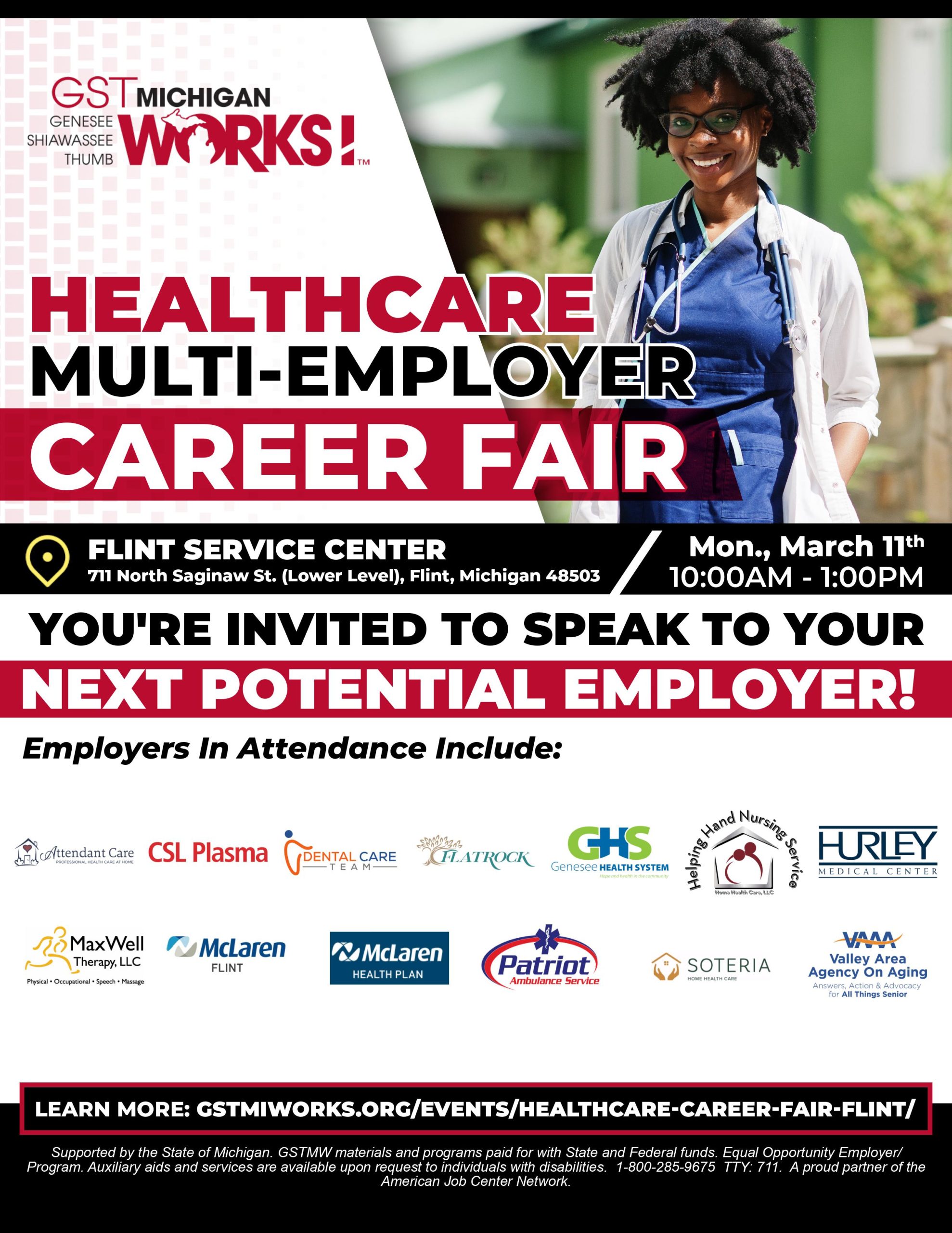 Flint, MI – The Genesee Shiawassee Thumb branch of Michigan Works (GST Michigan Works!) is hosting a multi-employer health care Career Fair in Flint on Monday, March 11. The job fair will take place from 10 a.m. to 1 p.m. at the GST Michigan Works! Flint Service Center at 711 N. Saginaw St., Flint 48503, on the Lower Level.