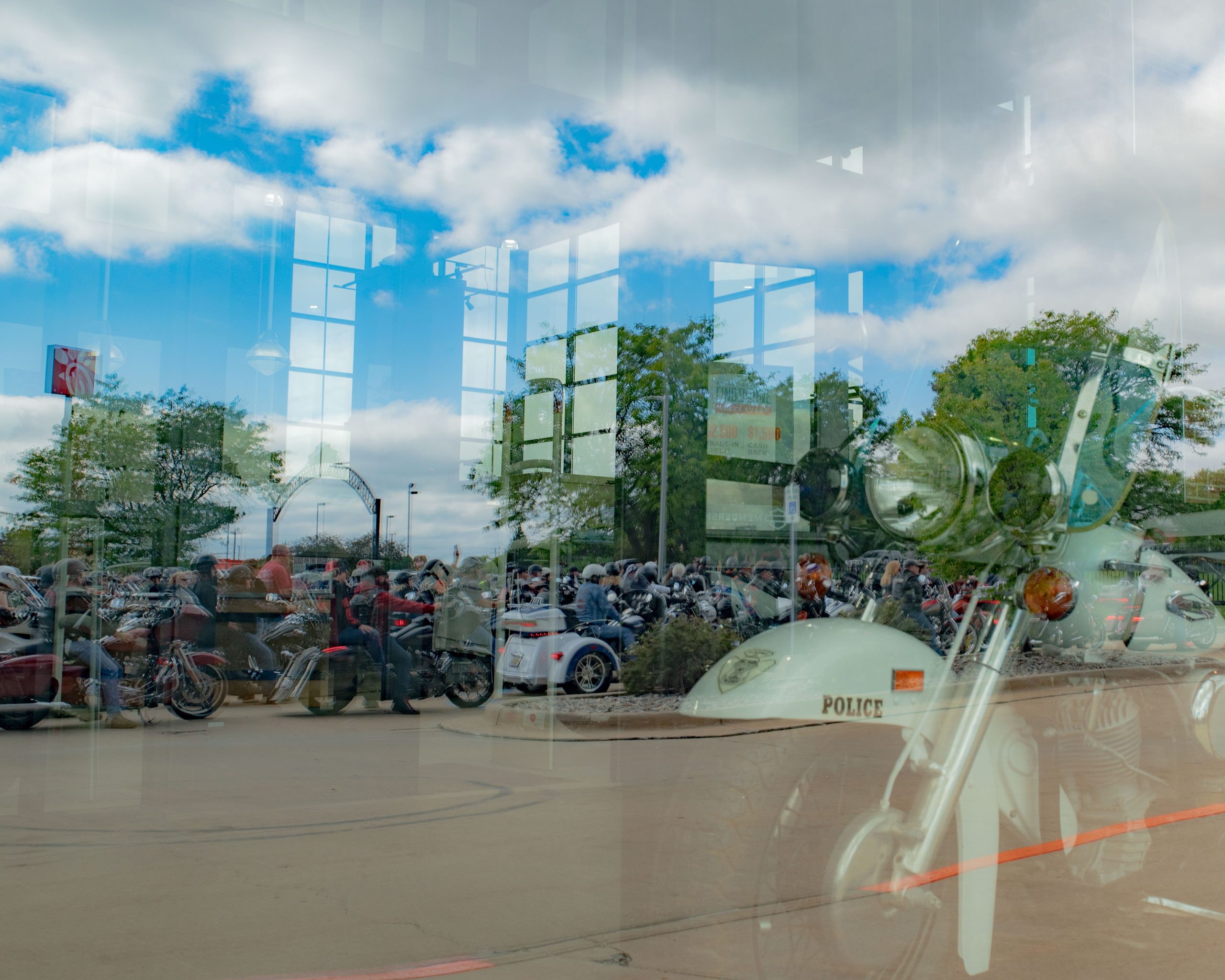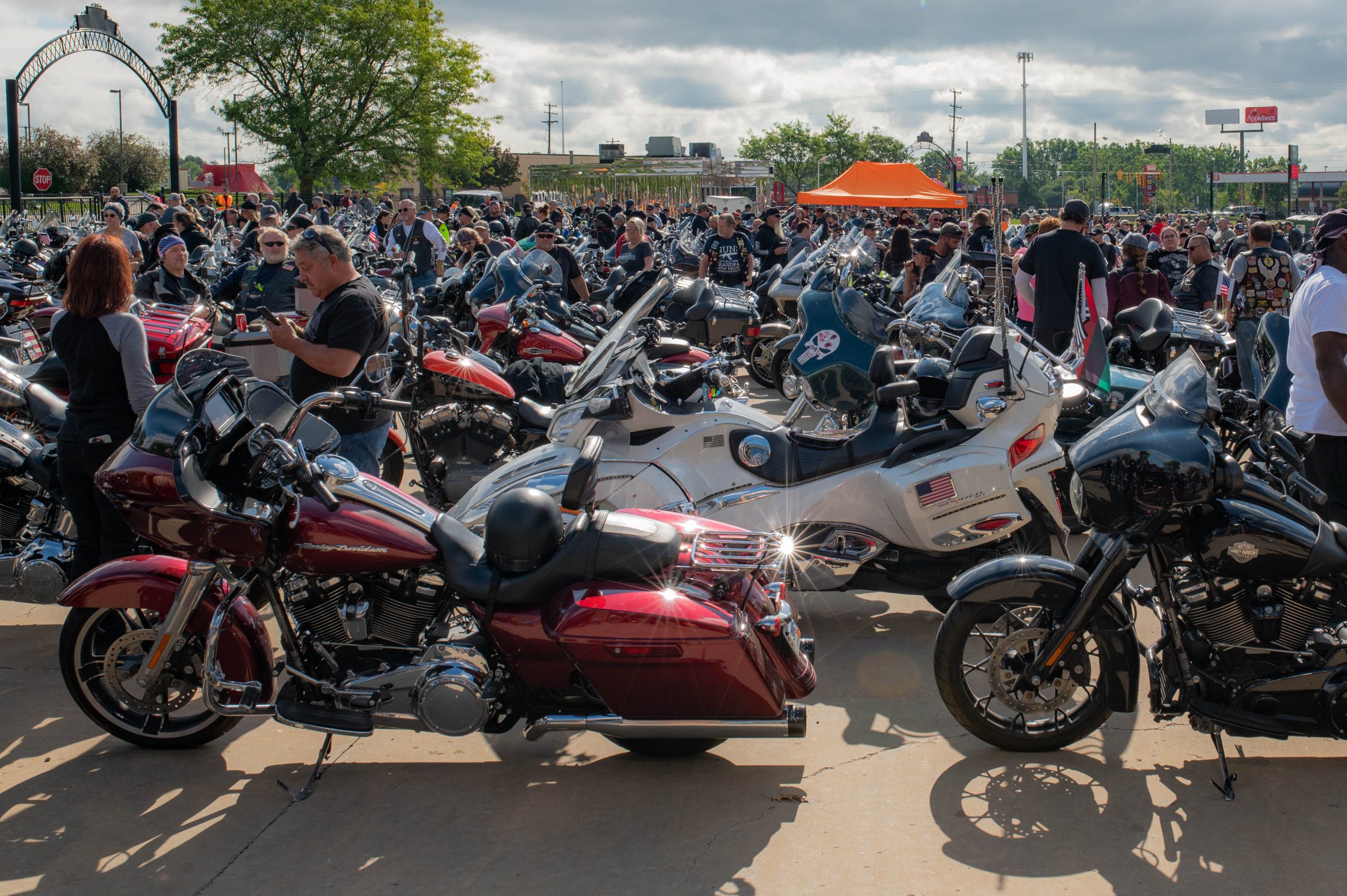 Motorcyclists park their bikes at the Vehicle City Harley-Davidson in preparation for a police-escorted to Bikes on the Bricks in downtown Flint, Mich. on Saturday, Sept. 9, 2023. (Michael Indriolo | Flint Beat)